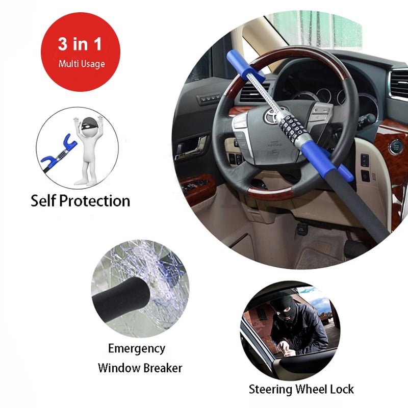 Αντικλεπτικό μπαστούνι αυτοκινήτου με συνδυασμό που κλειδώνει στο τιμόνι. Είναι κατάλληλο για αυτοκίνητα και φορτηγά. Τοποθετείται γρήγορα με μια κίνηση, αποθηκεύεται εύκολα μέσα στο αυτοκίνητο. Είναι ορατό ώστε να αποτρέπει ακόμα και την προσπάθεια κλοπής του αυτοκινήτου σας. Είναι κατασκευασμένο από ατσάλι και κλειδώνει με κλειδαριά 5 ψηφίων ώστε να μην χρειάζεται να έχετε κλειδί μαζί σας.