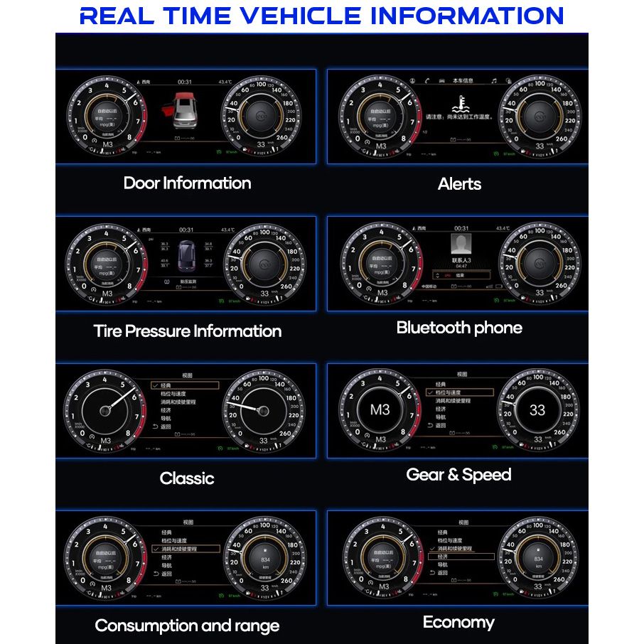 - Eight view mode: intelligent control of the whole car. 1. Classic mode, 2.Exercise mode, 3.Digital mode, 4.Gear and speed mode, 5.Consumption and mileage, 6.Economic mode, 7.Driving assistance mode, 8.Navigation mode.