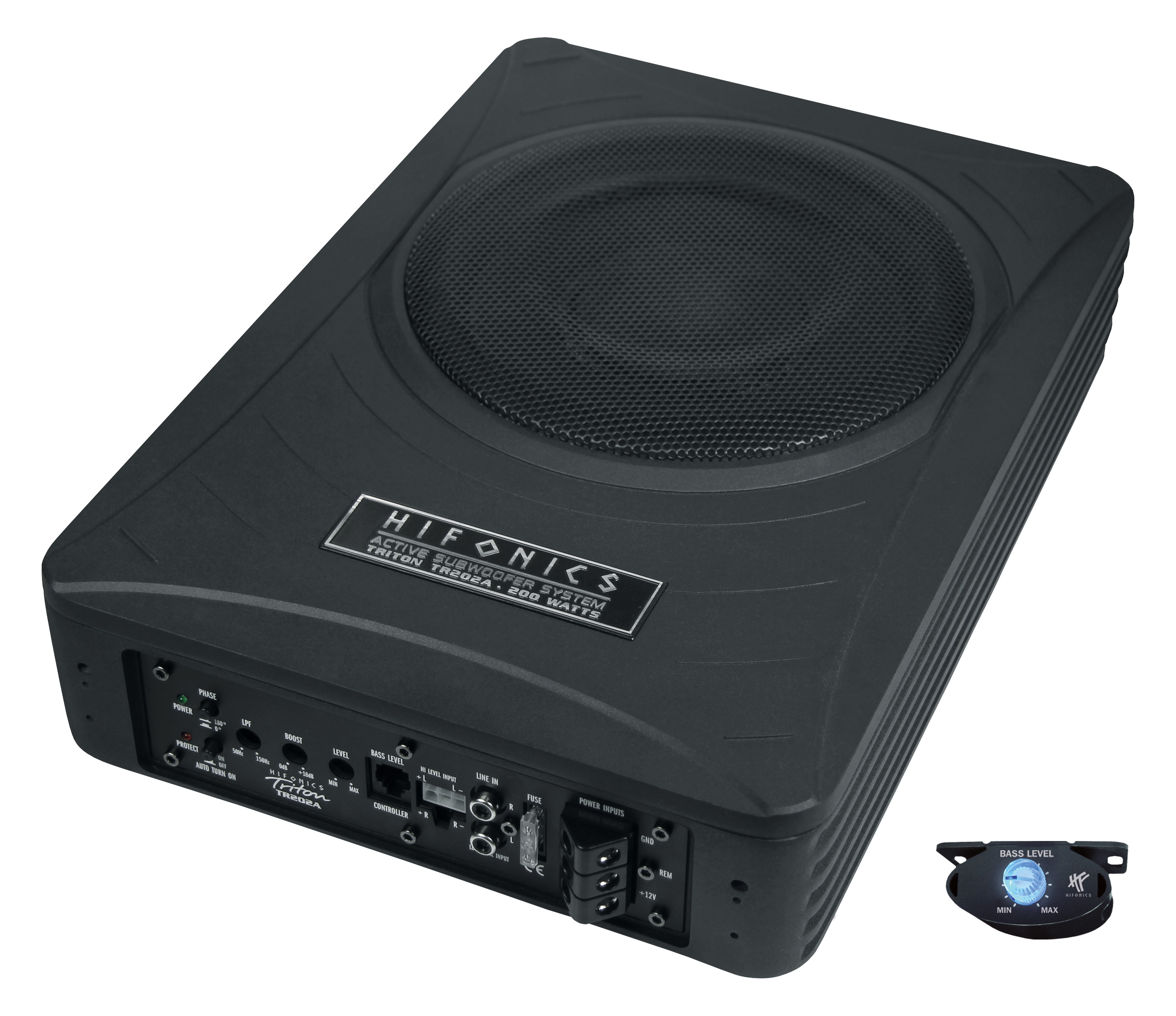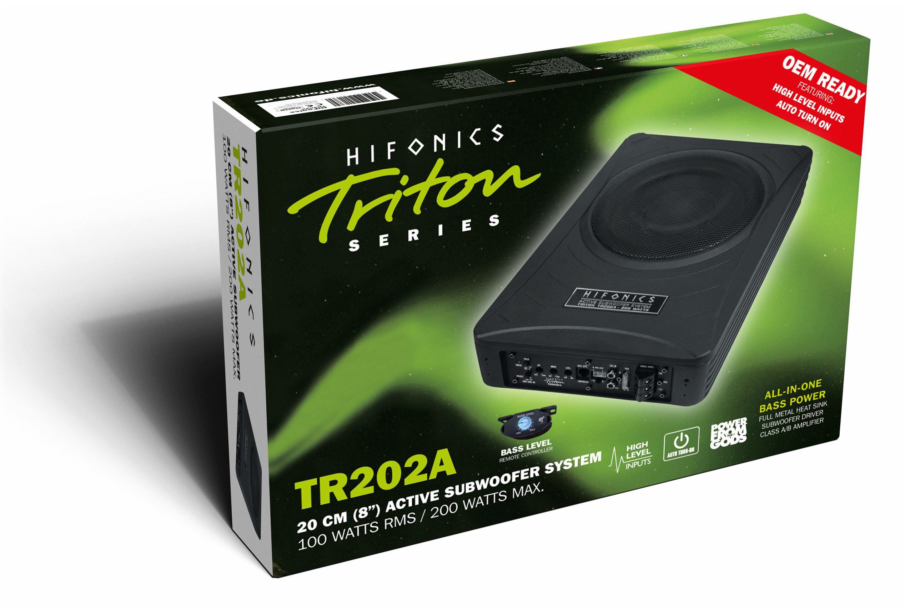 The new TRITON TR202A is a very compact active 8” (20 cm) subwoofer built-in a solid diecast aluminum housing, especially designed for in-car applications where space is limited but bass response needs improvement. The very heavy, with a special subwoofer and two lateral passive woofers equipped active box comes with a 100 RMS built-in amplifier with variable crossover, phase switch and subsonic filter. The included remote controller allows fine-tuning from the drivers seat for perfect matching to the full-range speaker components. High Level or low-level RCA sockets are provided for the input audio signal. TRITON TR202A Active Subwoofer System 20 cm (8“) Woofer 2 lateral Passive Woofers 100 W/RMS, 200 W/MAX Aluminum enclosure LP Crossover 50-150 Hz Bass Boost 0-18dB @ 45Hz Phase Switch 0/180° High or Low Level Inputs Auto Turn-On Subsonicfilter 20 Hz fixed Bass-Remote included 245 x 75 x 345 mm