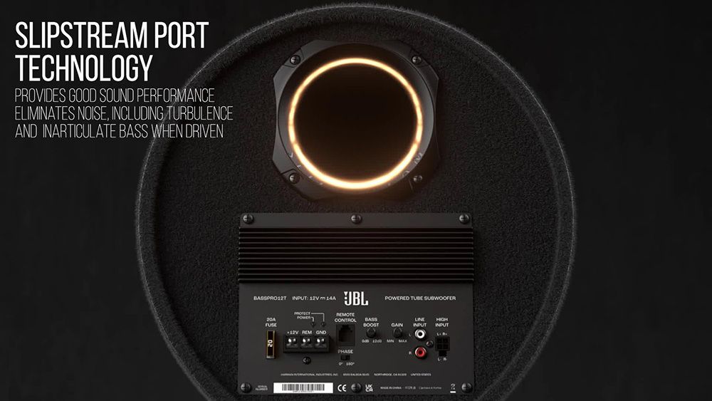 JBL BassPro Tube Subwoofer delivers 150 Watts of powered noise-free deep bass thanks to JBL’s patented Slipstream port technology. The Slipstream port is mathematically engineered to keep airflow with the port turbulence-free, which avoiding the common shortcoming of traditional ported boxes. Coupled with the built-in 150Wrms amplifier the BassPro Tube Subwoofer really delivers. Also the Bass Volume Remote control is included for easy adjustment, no more stopping to pop the trunk.