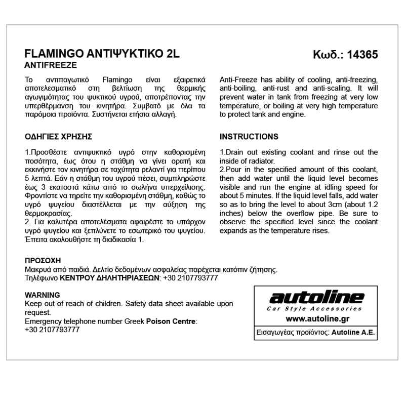 Το Anti-Freeze flamingo έχει την δυνατότητα προστασίας από διάβρωση, αντισκωριακή και αντιψυκτική προστασία. Αποτρέπει την ψύξη του νερού στη δεξαμενή σε πολύ χαμηλή θερμοκρασία ή τον βρασμό σε πολύ υψηλή θερμοκρασία συμβάλλοντας στην προστασία της δεξαμενής υγρών, του ψυγείου και του κινητήρα.