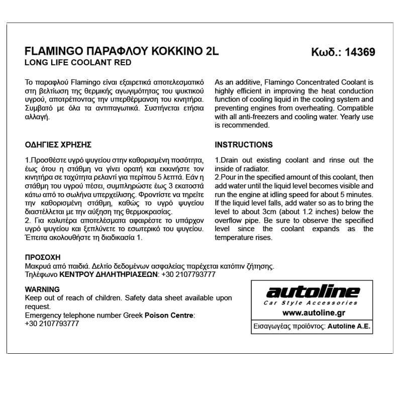 Το Κόκκινο Αντιψυκτικό Flamingo είναι εξαιρετικά αποτελεσματικό στη βελτίωση της λειτουργίας της θερμικής αγωγιμότητας του υγρού στο σύστημα ψύξης, αποτρέποντας τους κινητήρες από την υπερθέρμανση. Συμβατό με όλα τα αντιψυκτικά και το υγρό ψύξης. Με αντισκωριακές ιδιότητες.