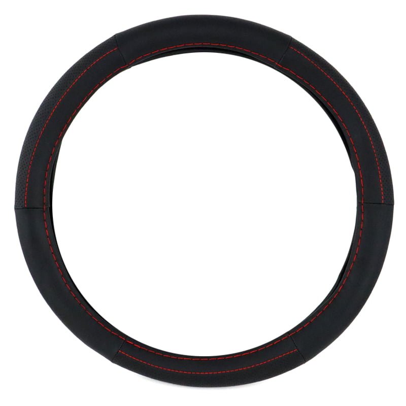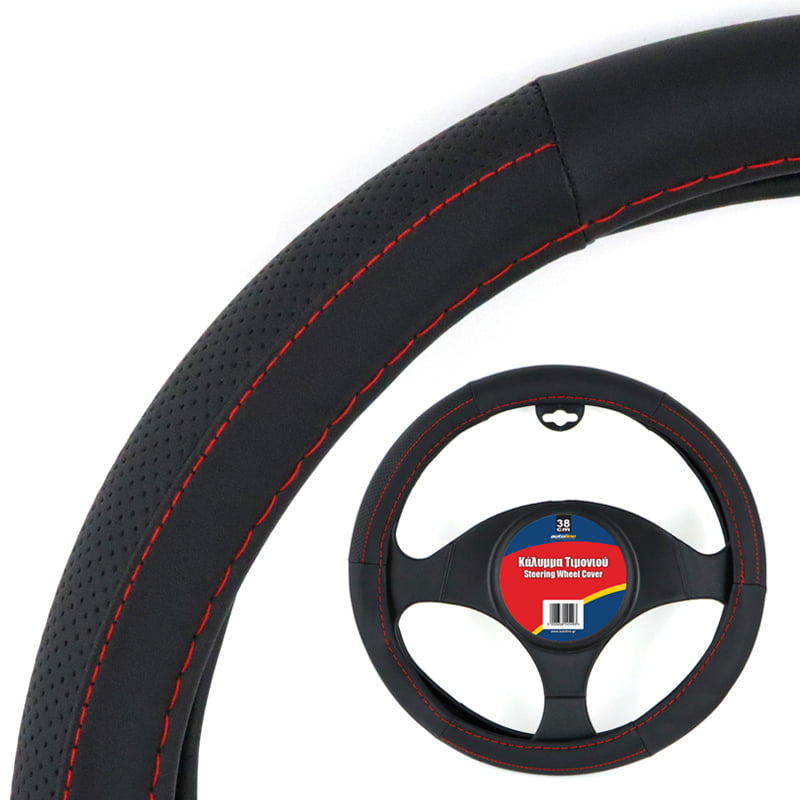 Κάλυμμα τιμονιού αυτοκινήτου για τιμόνια 38εκ. Είναι κατασκευασμένο από δερματίνη, υλικό που είναι εξαιρετικά λείο, με απαλή υφή και αντίσταση στους λεκέδες. Το δερματίνη προσφέρει μια "φυσική" αίσθηση στο χέρι κατά την οδήγηση. Παράλληλα προστατεύει από τη φθορά και βελτιώνει την εσωτερική όψη του αυτοκινήτου.