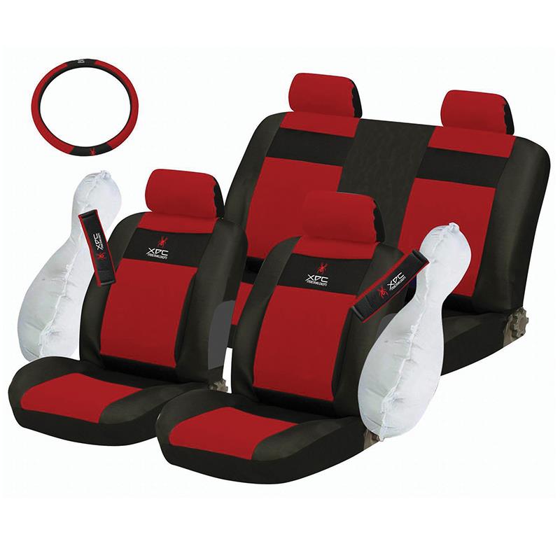Autoline Καλύμματα ΣΕΤ Universal με Αποσπώμενο Κεφαλάρι (Ύφασμα) XDC 11 τμχ με Μαξιλάρι Μέσης + Καλύμματα Ζωνών και Τιμονιού Συμβατό με Α - ΜΑΥΡΟ/ΚΟΚΚΙΝΟ