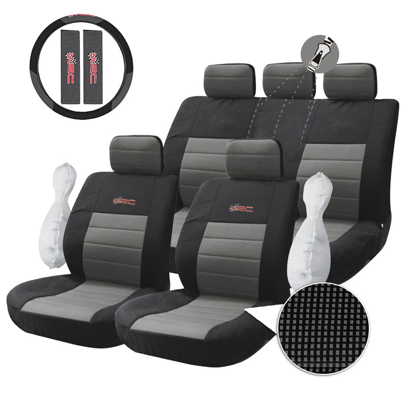 Autoline Καλύμματα ΣΕΤ Universal με Αποσπώμενο Κεφαλάρι (Ύφασμα) WRC 12 τμχ Διαιρούμενα + Καλύμματα Ζωνών και Τιμονιού Συμβατό με Αερόσακ - ΜΑΥΡΟ/ΓΚΡΙ
