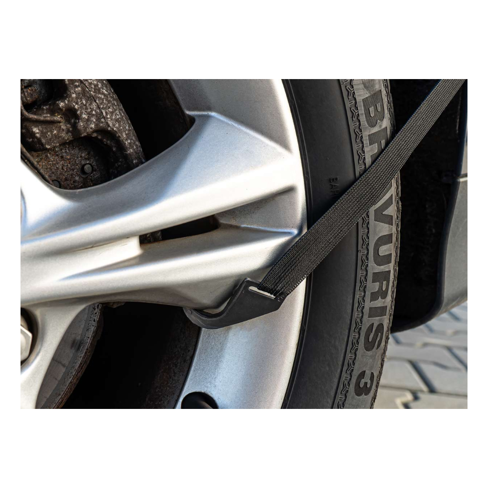 Το κάλυμμα στερεώνεται με λαστιχάκια με πλαστικούς γάντζους που στερεώνονται στις ζάντες ή στα τάσια του αυτοκινήτου.