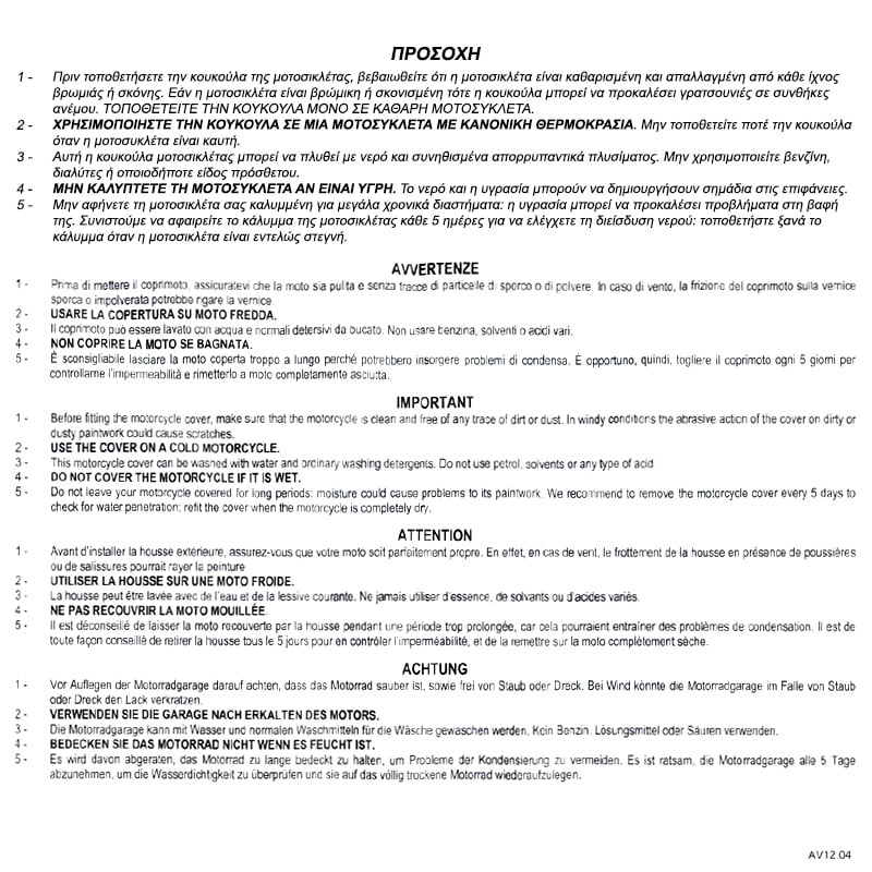 Προστατεύει από κακές καιρικές συνθήκες, βρωμιά και επιβλαβείς ουσίες. Είναι κατασκευασμένο από μαλακό και ανθεκτικό πλαστικό φιλμ, σταθεροποιημένο στην υπεριώδη ακτινοβολία και 100% αδιάβροχο. Παρέχει καλή βασική προστασία από τον ήλιο, τη βροχή, το χιόνι, τον παγετό, την αιθαλομίχλη, τους ρύπους και τη βρωμιά από πουλιά και δέντρα.