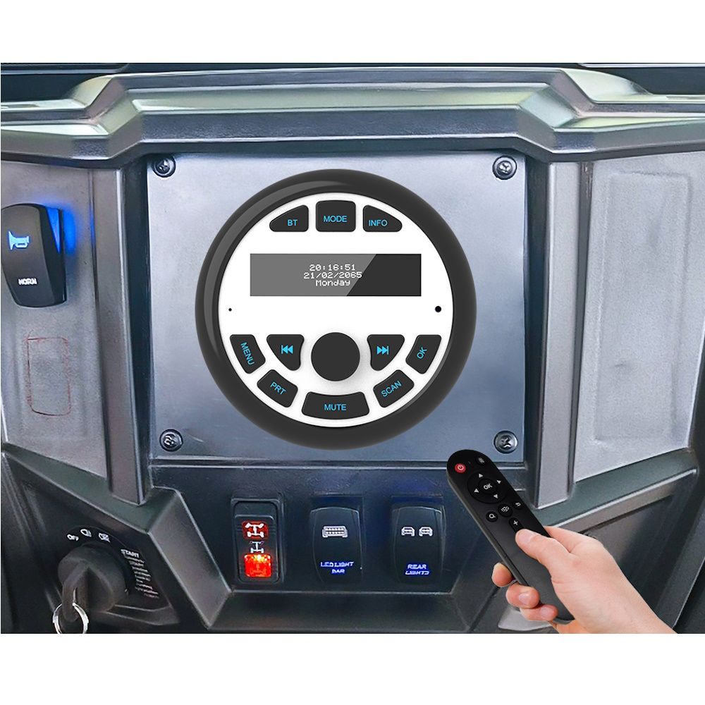 AM/FM, Bluetooth, and AUX input: Enjoy music anytime, anywhere. DUAL USB : USB play music – charge 1.2mA 50 station presets: For swift one-touch access to your preferred channels. UV resistance: Preserves functionality and longevity under sustained sunlight exposure. IP66 waterproof rating: Protects against powerful water jets and dust intrusion. Salt Fog Resistance: Withstands the corrosive effects of saltwater conditions. 2.8-inch LCD screen: Ensures clear visibility in different conditions.