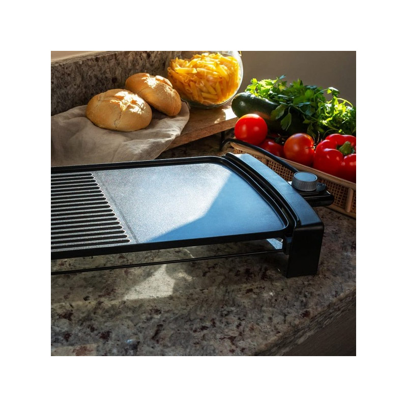 Με την ηλεκτρική ψηστιέρα - γκριλιέρα, από την εταιρία Cecotec, μπορείτε να ετοιμάσετε υγιεινά πιάτα με λιγότερο λάδι, χωρίς να ανησυχείτε για τα τρόφιμα που κολλάνε στην επιφάνεια μαγειρέματος. Με μεγάλη και μικτή επιφάνεια μαγειρέματος, 45 x 25 cm, δεν θα έχετε κανένα πρόβλημα όταν πρέπει να μαγειρέψετε κρέας, λαχανικά, τηγανητά αυγά, ψάρια και οστρακοειδή ή ακόμα και κρέπες.