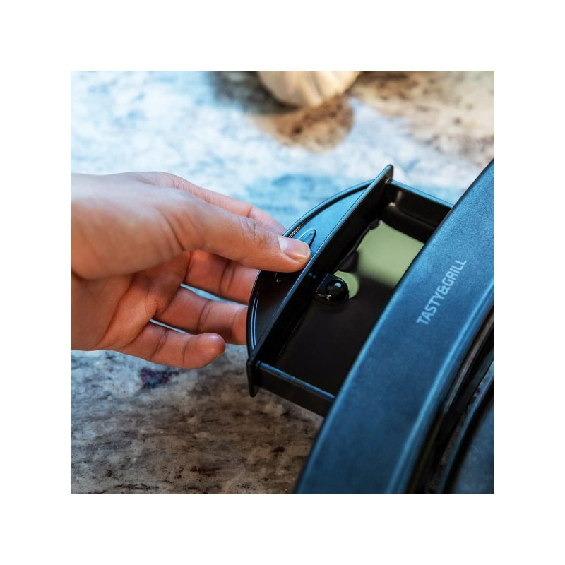 Είναι εξοπλισμένη με ρυθμιστή ισχύος, για να επιλέξετε τη θερμοκρασία που ταιριάζει καλύτερα στο φαγητό που θέλετε να μαγειρέψετε, για να πάρετε ομοιόμορφο και τραγανό αποτέλεσμα. Έχει αφαιρούμενο δίσκο συλλογής λίπους, ο οποίος πλένεται στο πλυντήριο πιάτων. Σχεδιασμένη για χρήση απευθείας στο τραπέζι ή ως δίσκος για να διατηρεί το φαγητό ζεστό για μεγαλύτερο χρονικό διάστημα.