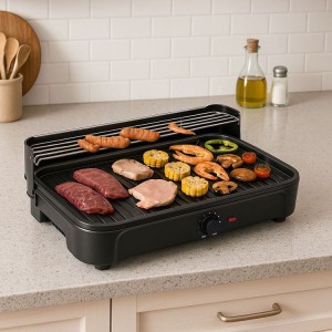 Η ηλεκτρική ψησταριά ισχύος 2000W είναι μια πολυλειτουργική συσκευή που συνδυάζει τις λειτουργίες ανάλογης ψησταριάς, επιτραπέζιας ψησταριάς και επιφάνειας ψησίματος. Διαθέτει αντικολλητική επίστρωση που αποτρέπει την προσκόλληση των φαγητών. Χάρη στον θερμοστάτη, ο χρήστης μπορεί εύκολα να προσαρμόσει τη θερμοκρασία ανάλογα με το είδος των φαγητών.