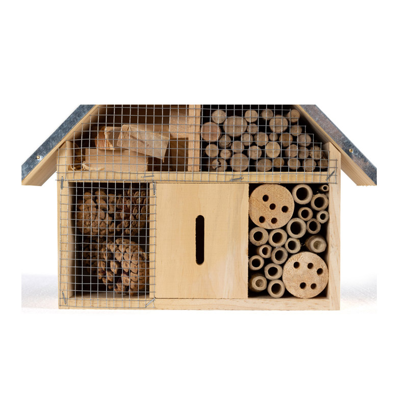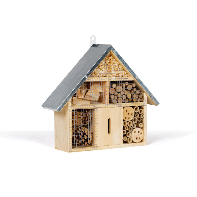 Το σπίτι για έντομα, από την εταιρία Inkazen, θα δώσει μια διακοσμητική πινελιά στον κήπο σας και θα είναι το ιδανικό καταφύγιο για έντομα απαραίτητα για τη φύση, είτε για φυτά, είτε για λουλούδια είτε για φυσική ρύθμιση. Οι επάνω θήκες με νεκρό ξύλο, άχυρο και στρογγυλό ξύλο είναι ιδιαίτερα κατάλληλες για μέλισσες και δερμάπτερα (ψαλίδες). Η θήκη με μπαμπού και τρυπημένο ξύλο για μέλισσες, το διαμέρισμα με τρύπες για πεταλούδες και αυτό με κουκουνάρια είναι ιδανικό για νευρόπτερα και πασχαλίτσες.