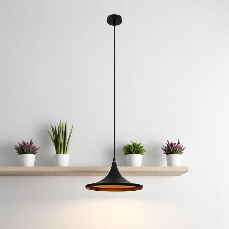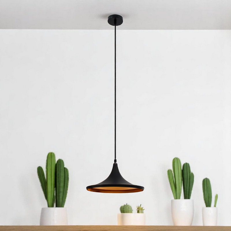 Αναβαθμίστε τον χώρο σας με αυτό το μοντέρνο κρεμαστό φωτιστικό μονόφωτο, σχεδιασμένο με καμπάνα από υψηλής ποιότητας μέταλλο. Το εξωτερικό μαύρο χρώμα συνδυάζεται αρμονικά με το χρυσό εσωτερικό, προσφέροντας ζεστό φωτισμό και μοναδική αισθητική. Ιδανικό για σαλόνια, τραπεζαρίες ή επαγγελματικούς χώρους με industrial ή μοντέρνο στυλ. Εύκολη εγκατάσταση με βάση οροφής και βίδες στήριξης.