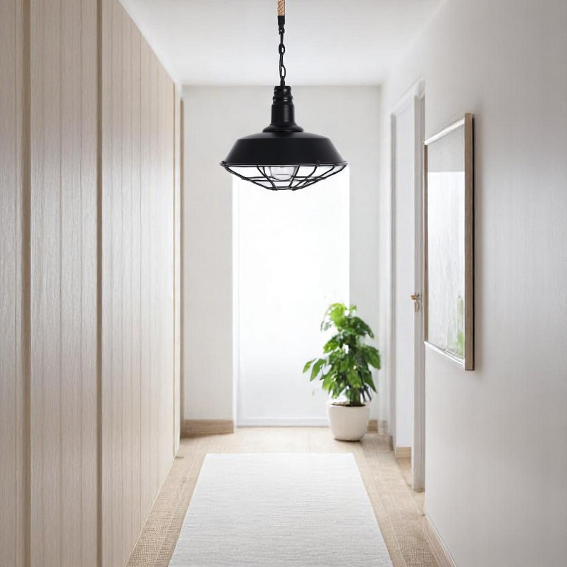 Το Rope Cage είναι ένα εντυπωσιακό κρεμαστό μονόφωτο φωτιστικό, σχεδιασμένο για να προσφέρει industrial αισθητική σε κάθε χώρο. Διαθέτει μαύρο μεταλλικό σκελετό με πλέγμα, διακοσμητικό σχοινί και ντουί E27 για εύκολη τοποθέτηση λάμπας της επιλογής σας. Η στιβαρή κατασκευή του και ο ιδιαίτερος σχεδιασμός το καθιστούν ιδανικό για σαλόνια, τραπεζαρίες, μπαρ ή επαγγελματικούς χώρους που θέλουν να ξεχωρίσουν. Εύκολη εγκατάσταση με βάση οροφής και βίδες στήριξης.