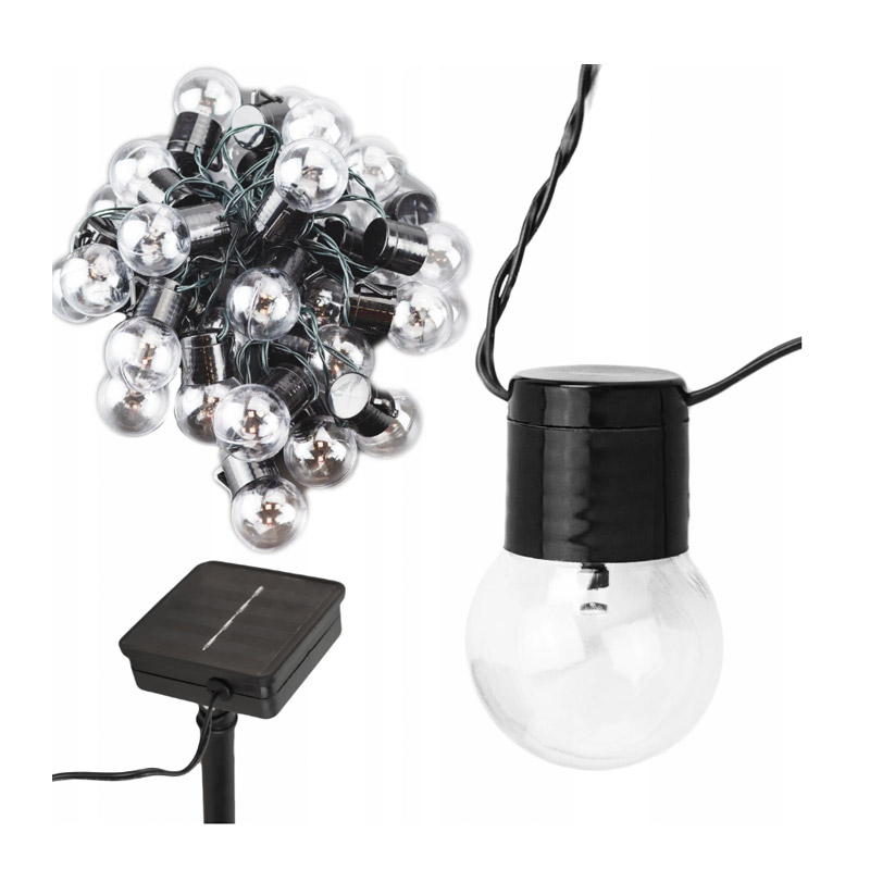 Η ηλιακή γιρλάντα, από την εταιρία SPM, είναι κατάλληλη για κήπους, φυτά, βεράντες και μπαλκόνια. Έχει μήκος 5 μέτρα και διαθέτει 20 λαμπτήρες G40 με φωτισμό χρώματος λευκό. Τροφοδοτείται από ένα ηλιακό πάνελ, επαναφορτίζεται με φως και παρέχει φωτισμό για αρκετές ώρες μετά το σκοτάδι. Το πάνελ διαθέτει πάσσαλο για τη στήριξη στο έδαφος.