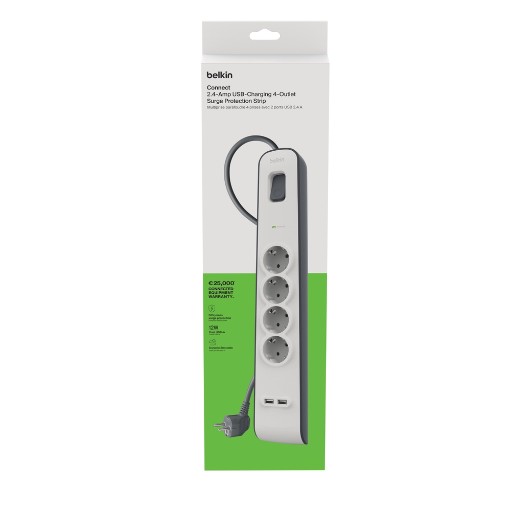 Προστατέψτε τις ηλεκτρονικές συσκευές σας από επικίνδυνες υπερτάσεις και απότομες διακυμάνσεις ρεύματος με το Πολύπριζο Ασφαλείας 4 Θέσεων της Belkin με δύο θύρες USB. Απλώς συνδέστε το σε οποιαδήποτε πρίζα και προστατέψτε έως και τέσσερις συσκευές AC και δύο συσκευές USB από υπερτάσεις, κεραυνούς και αλλοιώσεις ρεύματος.
