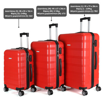 Σετ βαλίτσες ταξιδιού σκληρές 3 τμχ σε κόκκινο χρώμα με 4 τροχούς Royalty Line RL-LTS-18706-RED