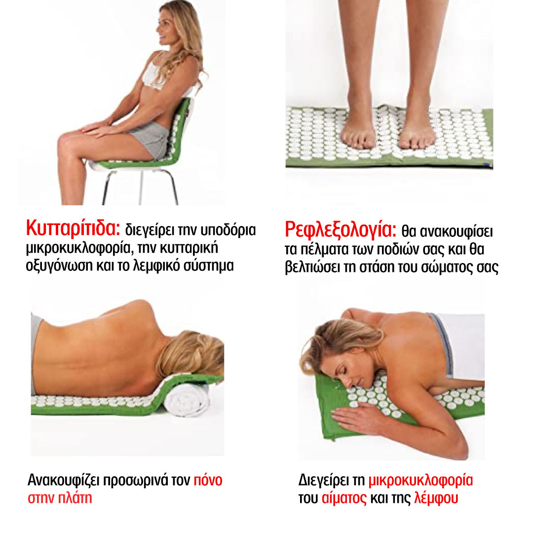 Το χαλάκι βελονισμού περιέχει πλαστικά άκρα που ασκούν πίεση σε πολλά σημεία του σώματός σας προσφέροντας έτσι ανακούφιση από: