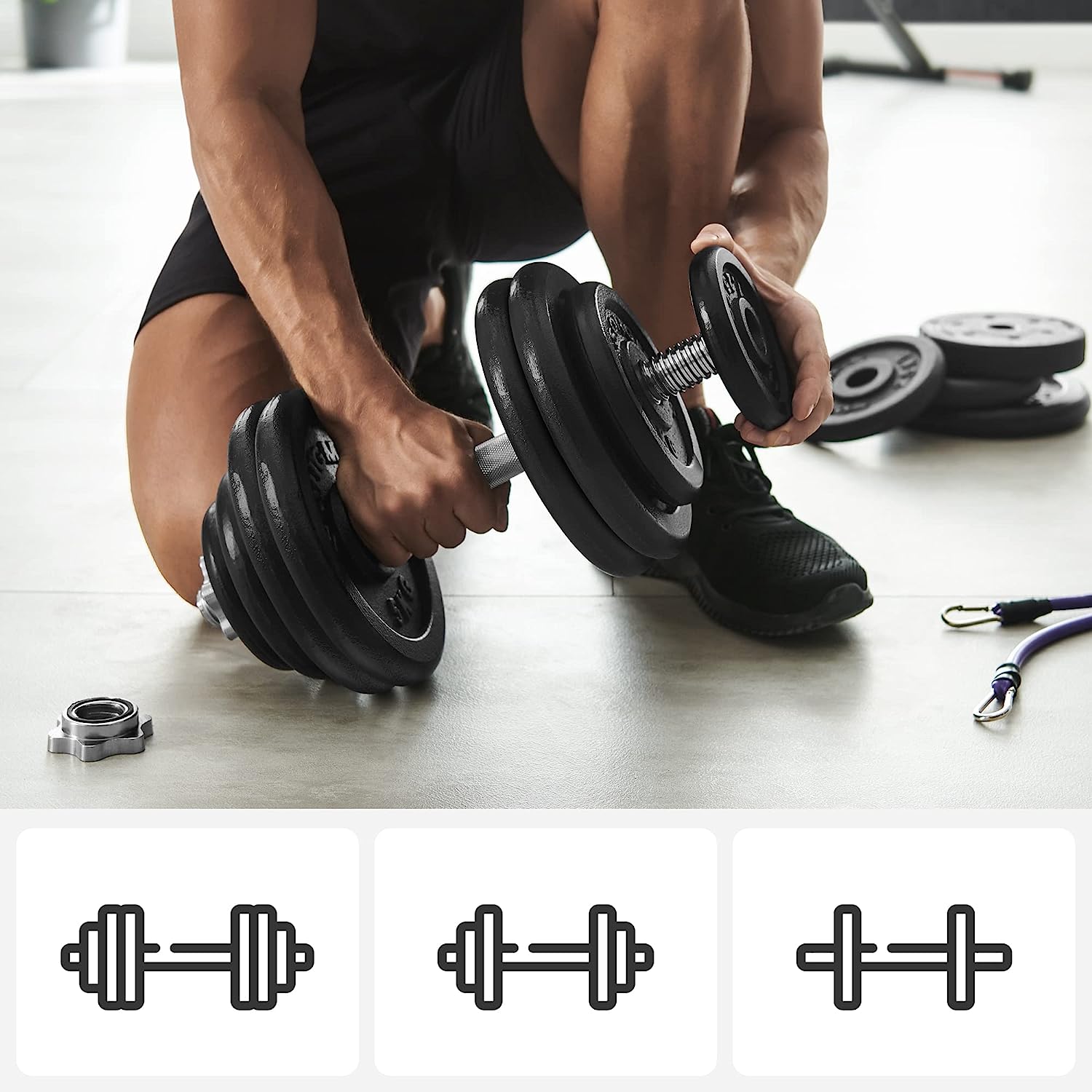 Κάμψεις δικεφάλων για να δουλέψετε τα χέρια σας; Προβολές ή καθίσματα για να στοχεύσετε τα πόδια σας; Κανένα πρόβλημα. Μπορείτε να συνδυάσετε τους δίσκους ελεύθερα για να ικανοποιήσετε τις διάφορες απαιτήσεις της προπόνησής σας.Το σετ περιλαμβάνει: