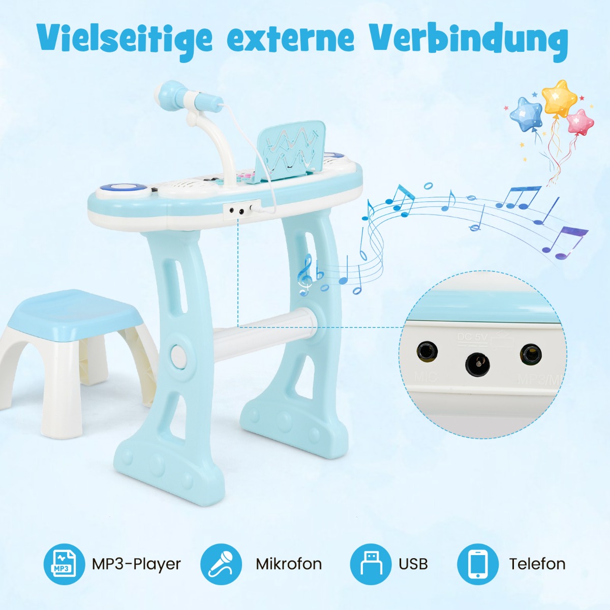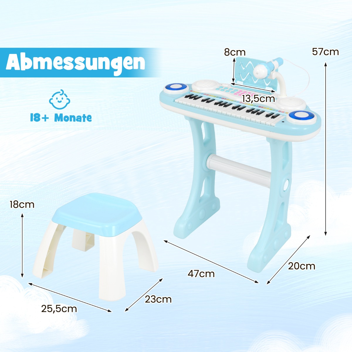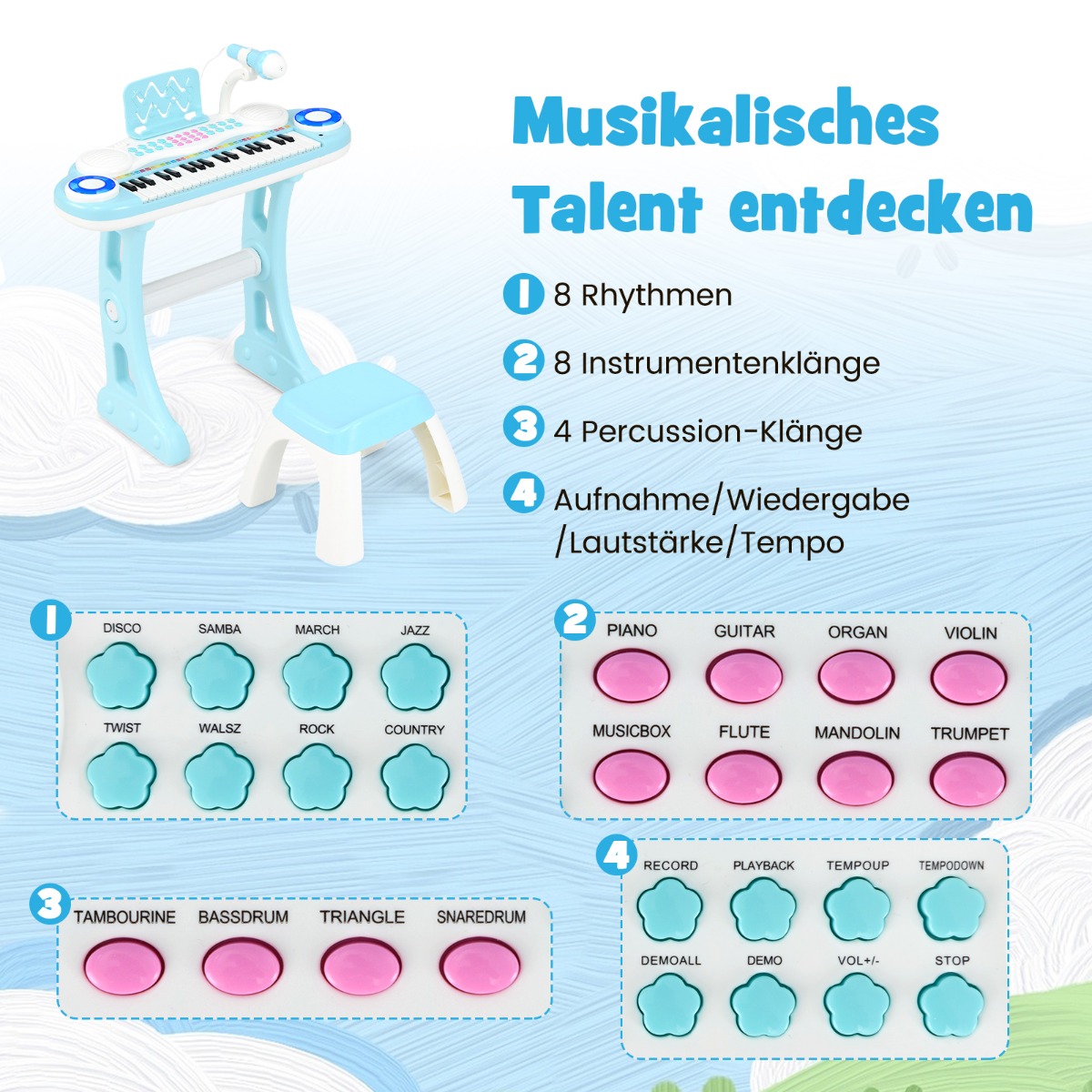 Το σετ πληκτρολογίου πιάνου 37 πλήκτρων είναι μια ιδανική επιλογή για παιδιά από 18 μηνών. Προσφέρει πολλές λειτουργίες για διασκέδαση, όπως 8 ήχους οργάνων, 8 ρυθμούς και 4 ήχους κρουστών. Τα παιδιά μπορούν να προσαρμόσουν την ταχύτητα και την ένταση σύμφωνα με τις ανάγκες τους. Τα αναβοσβήνοντα φώτα ενθουσιάζουν τους μικρούς λάτρεις της μουσικής, και η λειτουργία εγγραφής και αναπαραγωγής προσφέρει επιπλέον διασκέδαση. Τα παιδιά μπορούν να τραγουδήσουν με ένα ρυθμιζόμενο μικρόφωνο και να τοποθετήσουν τις νότες στη βάση μουσικής για εξάσκηση. Χάρη στα αφαιρούμενα πόδια, το πληκτρολόγιο πιάνου μπορεί να χρησιμοποιηθεί σε οποιαδήποτε επιφάνεια τραπεζιού ή στο πάτωμα.