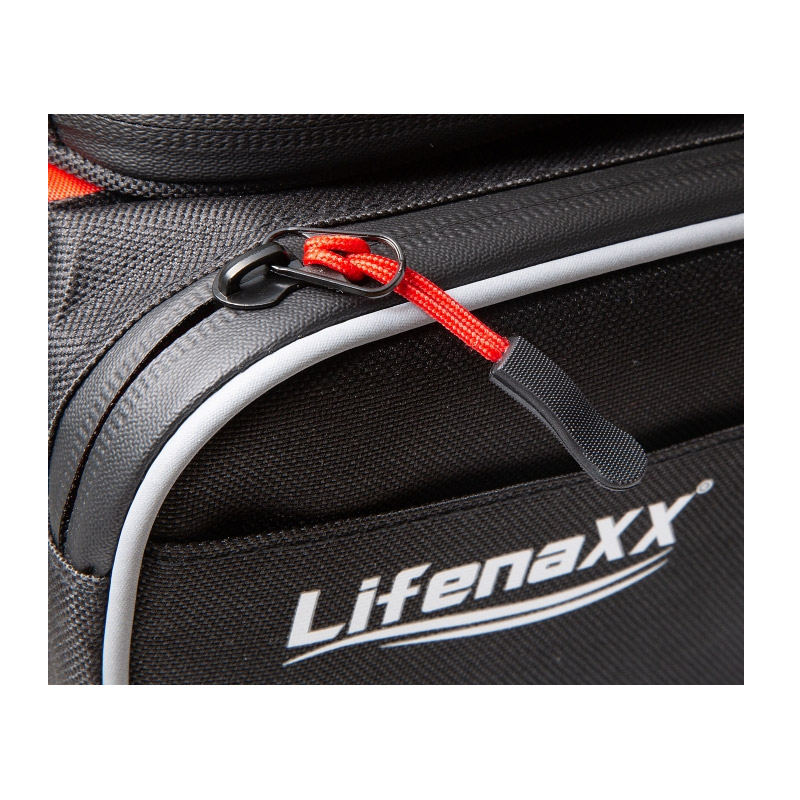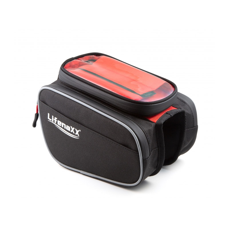 Η τσάντα, από την Lifenaxx, διαθέτει αδιάβροχη κατασκευή και τοποθετείται στο πλαίσιο του ποδήλατου. Έχει αποσπώμενη θήκη για smartphone έως 6.7", 2 πλαϊνές θήκες με φερμουάρ και άνοιγμα για καλώδιο ακουστικών.