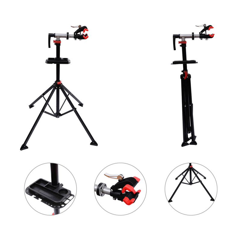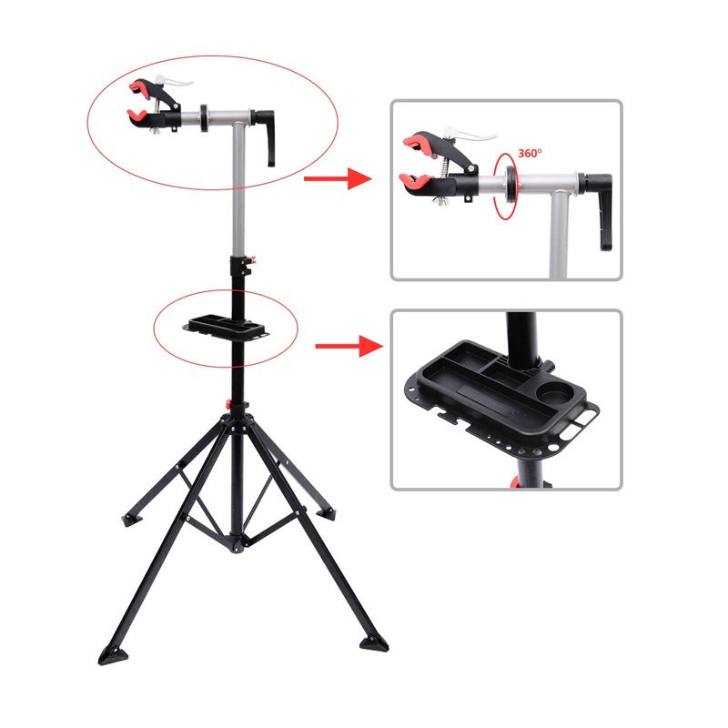 Η βάση σας βοηθά να εκτελείτε τις κύριες δραστηριότητες συντήρησης του ποδηλάτου σας, όπως λίπανση, καθαρισμός, ρύθμιση των φρένων, κιβώτιο ταχυτήτων και άλλα. Η σταθερή δομή 4 ποδιών μπορεί να ανοίξει εάν είναι απαραίτητο. Κατά τη διάρκεια της εργασίας η ρυθμιζόμενη σε ύψος τηλεσκοπική ράβδο κρατά το ποδήλατο στο επιθυμητό σημείο, ενώ το πλαίσιο στερεώνεται με το ρυθμιζόμενο σφιγκτήρα. Αυτή η άνετη θέση εργασίας σας επιτρέπει να πραγματοποιείτε επισκευές στο επίπεδο των ματιών χωρίς να τεντώνετε την πλάτη και τα γόνατά σας.