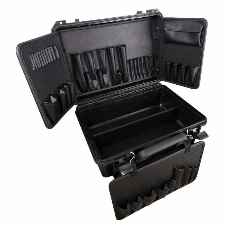 Η εργαλειοθήκη έχει σχεδιαστεί ειδικά για εργαλεία ποδηλάτου. Είναι κατασκευασμένη από πλαστικό βαρέως τύπου, είναι αδιάβροχη και ανθεκτική στη σκόνη. Διαθέτει ένα αποσπώμενο δίσκο που γαντζώνεται σε τρύπες στην μπροστινή πλευρά της εργαλειοθήκης, επιτρέποντάς σας να έχετε όλα τα εργαλεία στη διάθεσή σας. Ο δίσκος έχει 9 τσέπες που έχουν σχεδιαστεί για να μεταφέρουν τα πάντα, από πένσα μέχρι ανοιχτά κλειδιά. Τα πτερύγια στο καπάκι μπορούν να κλείσουν ερμητικά με τους ιμάντες Velcro. Oταν είναι κλειστά, στερεώνουν επίσης τα εργαλεία στη θέση τους. Τα ανοιγόμενα πτερύγια και το εσωτερικό μέρος του καπακιού είναι εξοπλισμένα με 35 ανεξάρτητες τσέπες για τη μεταφορά των εργαλείων σας. Οι μεγαλύτερες τσέπες μπορούν να μεταφέρουν τα κλειδιά allen με λαβή Τ μέχρι το μέγεθος 10 και μια ειδική μικρή τσέπη μπορεί να κρατήσει με ασφάλεια τα κλειδιά allen σε σχήμα L ή άλλα μικροεξαρτήματα τακτοποιημένα. Χαρακτηριστικά: Οι τσέπες είναι ραμμένες με ανθεκτική νάιλον κλωστή. Αδιάβροχη και ανθεκτική στη σκόνη σύμφωνα με το πιστοποιητικό IP67. Αδιάβροχη στεγανοποίηση γύρω από το καπάκι. Αυτόματη βαλβίδα απελευθέρωσης πίεσης. Εύκολο άνοιγμα/κλείσιμο κλείστρων. Δοκιμασμένη στο βάρος μαλακή χειρολαβή. Υποδοχές για ιμάντα ώμου (ο ιμάντας δεν συμπεριλαμβάνεται). Στιβαρή κατασκευή από συνθετικό υλικό βαρέως τύπου. Πείροι από νάιλον, ανθεκτικοί στη διάβρωση. Αποσπώμενος δίσκος με 9 τσέπες, σχεδιασμένος για πενσοειδή ή/και γερμανοπολύγωνα. Διαχωριστικό αλουμινίου στο κάτω μέρος της εργαλειοθήκης για να κρατάτε τα εργαλεία σας οργανωμένα. Τα πτερύγια διπλώνουν προσεκτικά στο καπάκι της εργαλειοθήκης. Το καπάκι φέρει κλειδιά άλλεν με λαβή Τ έως το μέγεθος 10. Ειδικές σφιχτές τσέπες ασφαλείας για τη συγκράτηση μικρών εργαλείων. 44 τσέπες συνολικά & αποθηκευτικός χώρος κάτω από τον δίσκο.