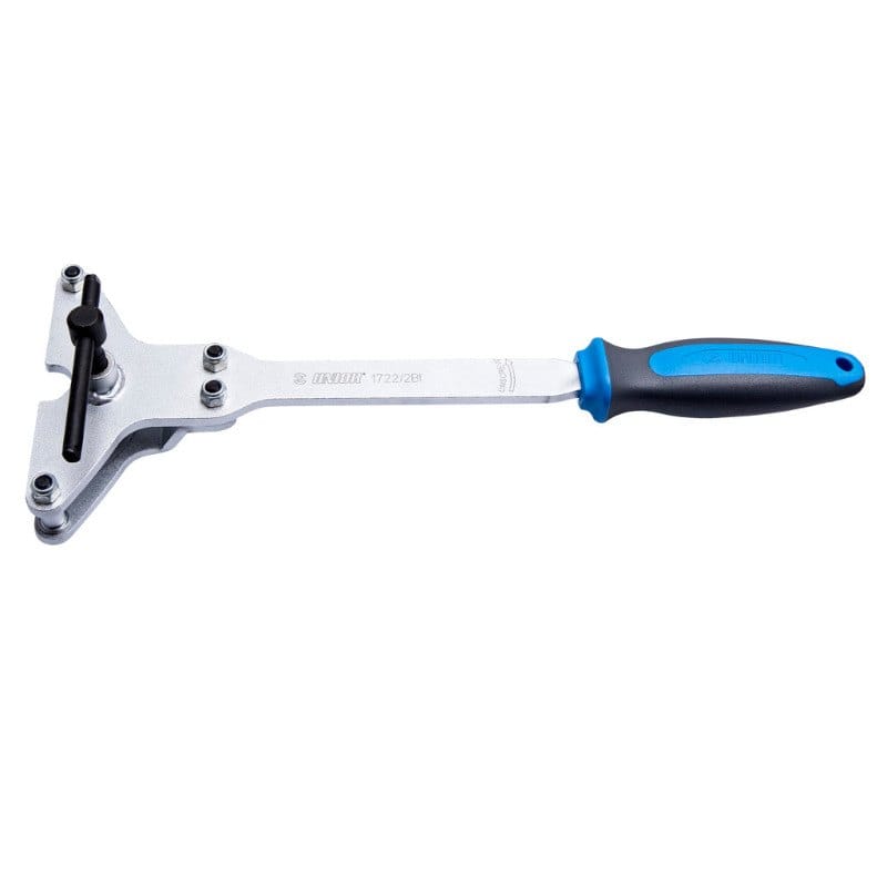 Η αλλαγή γραναζιών σε κασέτες με σπείρωμα μπορεί να είναι χρονοβόρα διαδικασία. Το 1722/2ΒΙ είναι ένα μοναδικό εργαλείο για την αφαίρεση διαφορετικών ειδών γραναζιών από τέτοια συστήματα. Με το 1722/2ΒΙ της UNIOR, μπορείτε να πιάσετε γερά το γρανάζι από τις δύο πλευρές και να γυρίσετε τον άξονα ώστε να το ασφαλίσετε σταθερά. Ο άξονας και τα πλαϊνά του εργαλείου δημιουργούν μία γερή λαβή. Στρέφοντας το εργαλείο αριστερόστροφα, μπορείτε να ξεβιδώσετε το γρανάζι.