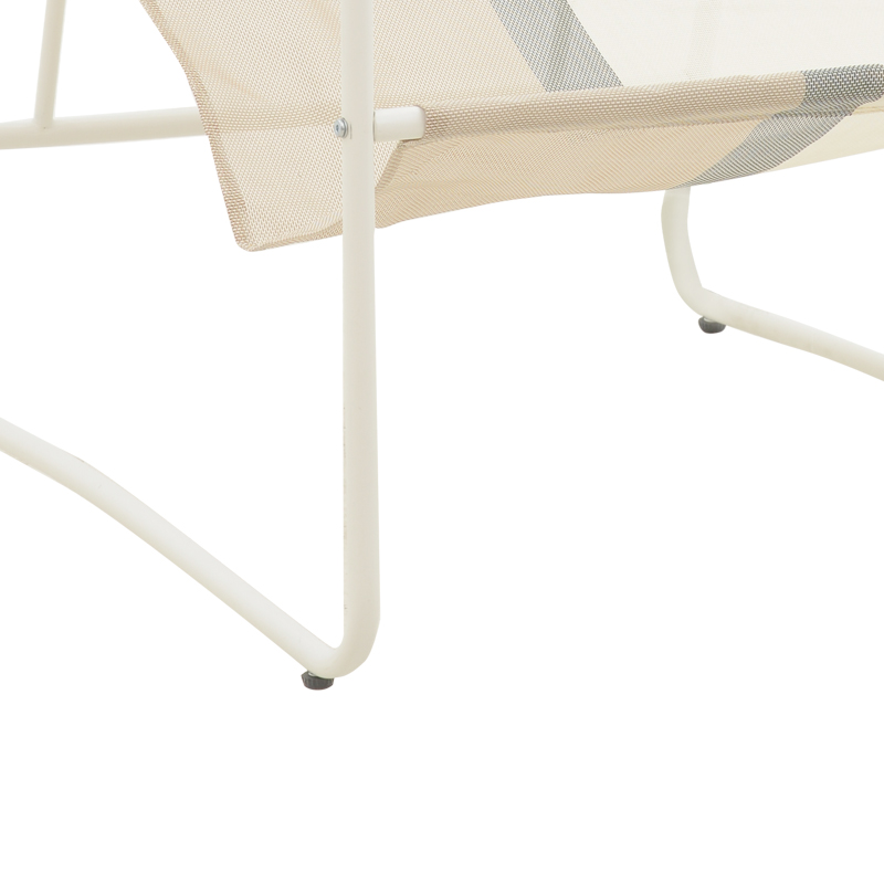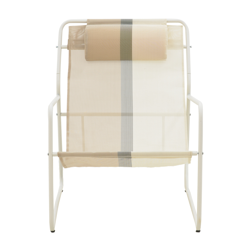 * Επένδυση υφάσματος textinene γκρι-εκρού χρώματος. Το textilene είναι ύφασμα μεγάλης αντοχής στην ηλιακή ακτινοβολία UV και την υγρασία, ενώ παράλληλα αφήνει το δέρμα να "αναπνέει" δημιουργώντας έτσι άνεση στην έδραση.