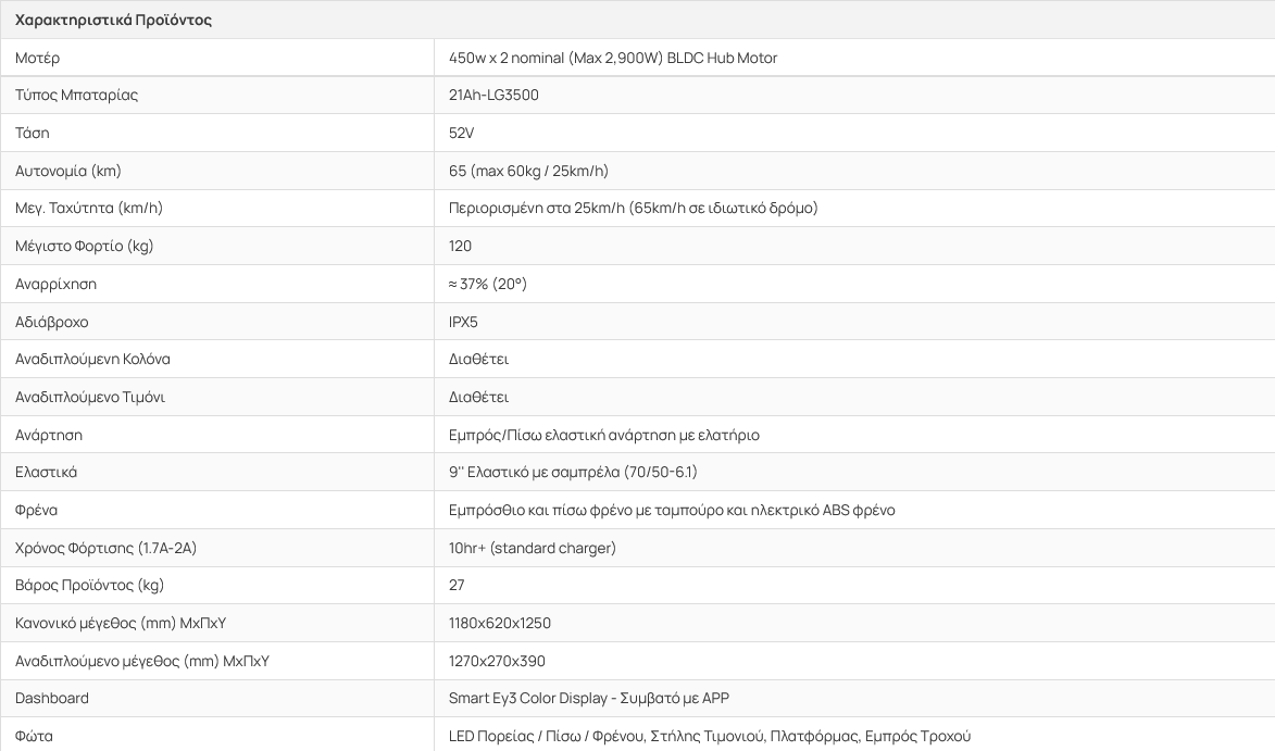 • Το αποτέλεσμα είναι ένα ισχυρό σκούτερ που είναι συνδυάζει την πρακτικότητα με την λειτουργικότητα, με χαρακτηριστικά όπως κόρνα, προβολέα, πλατφόρμα από καουτσούκ και τη νέα έγχρωμη οθόνη EY3"
