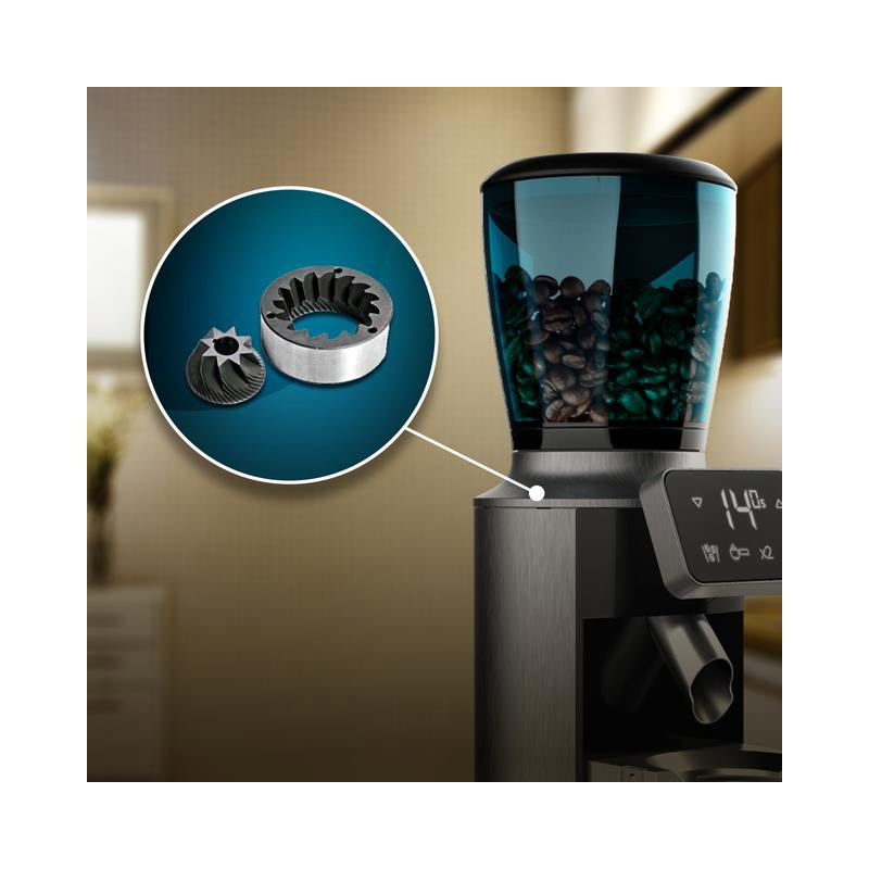 Ο μύλος, έχει δοχείο (αφαιρούμενο) που αποθηκεύει έως και 300 g κόκκους καφέ με αεροστεγές καπάκι (διατηρεί τους κόκκους καφέ με όλο τους το άρωμα) και δεξαμενή που αποθηκεύει έως και 200 g σκόνης καφέ, φτιάχνοντας έως και 14 φλιτζάνια καφέ. Με πίνακα ελέγχου αφής για να τον ελέγχετε με ένα μόνο άγγιγμα.