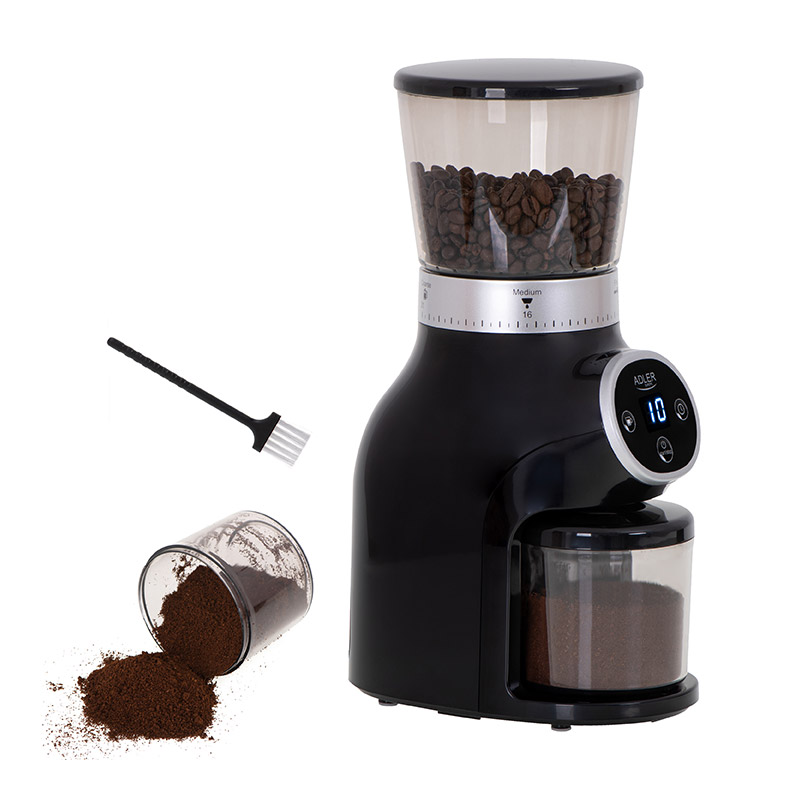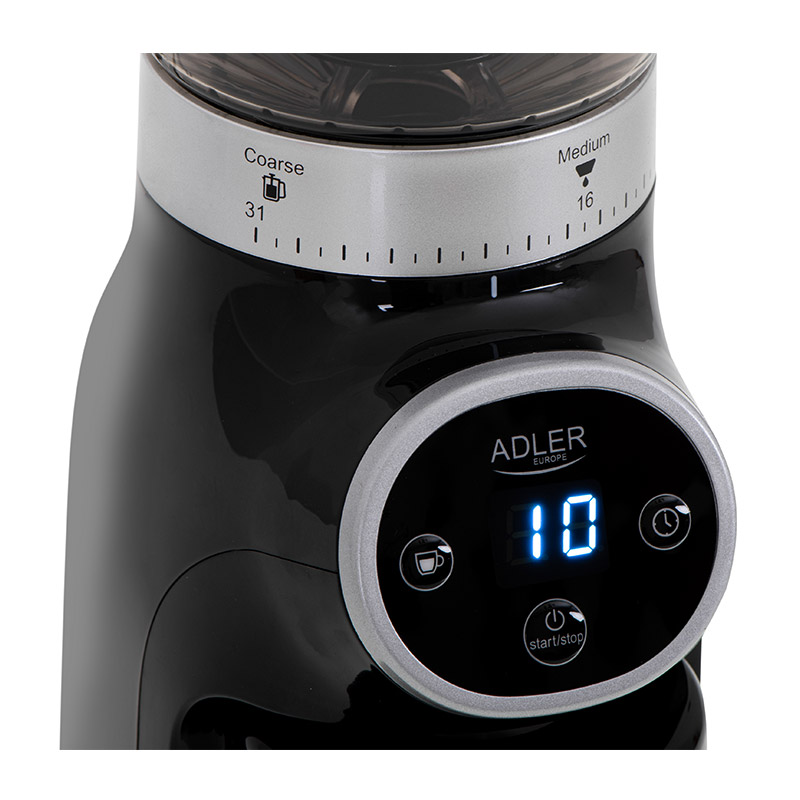 Ο μύλος άλεσης καφέ, από την εταιρία Adler, έχει κωνικά μαχαίρια για ομοιόμορφη κοπή. Προσφέρει αλεσμένο καφέ με μικρότερη ταχύτητα κοπής και τέλειο αποτέλεσμα για κάθε άλεσμα κόκκων καφέ που θέλετε. Δυνατό μοτέρ με μέγιστη ισχύ 300 W. Έχει 31 βαθμίδες άλεσης και μπορεί να κόψει από πολύ ψιλοκομμένο Ελληνικό καφέ, εσπρέσο μέχρι και Γαλλικό που να ταιριάζει σε όλες τις μηχανές.