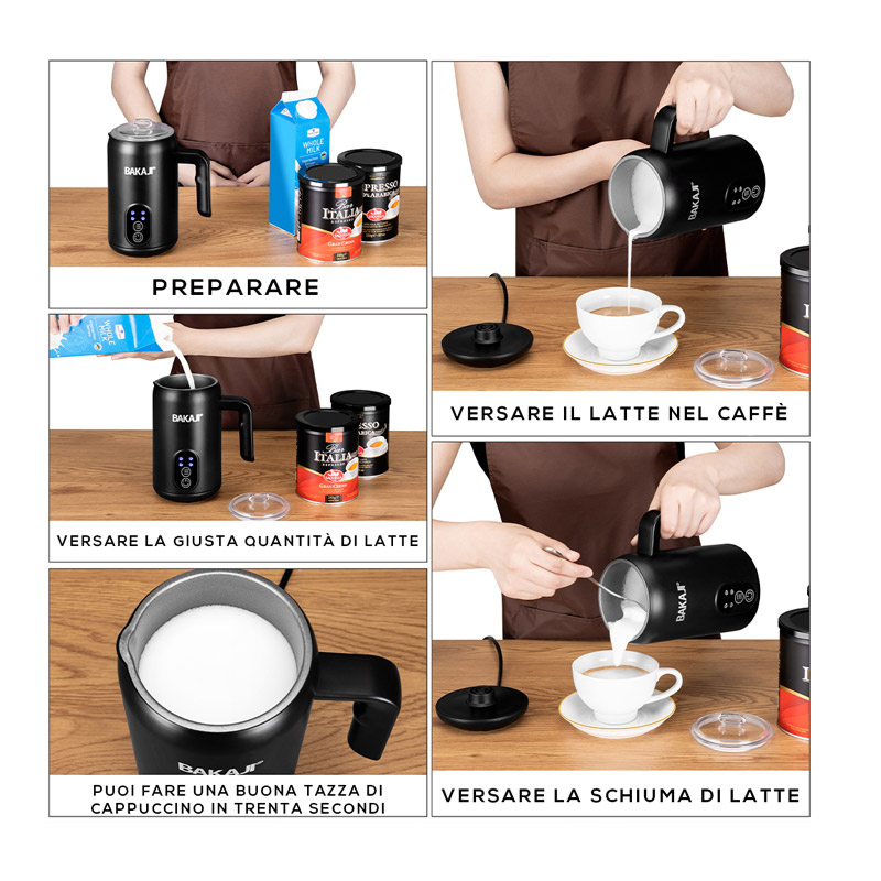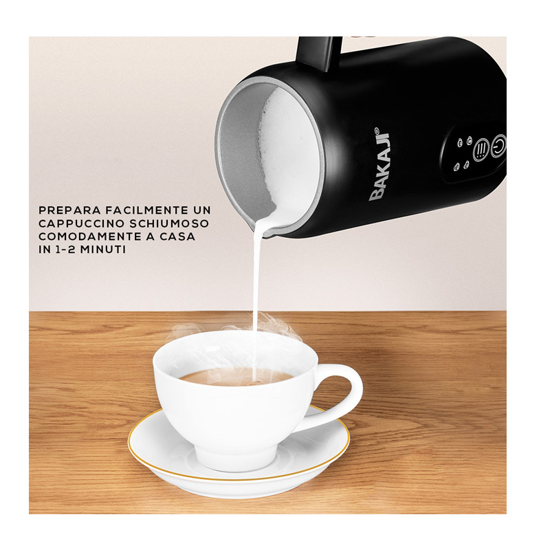 Η συσκευή, από την εταιρία Bakaji, παράγει ζεστό ή κρύο αφρόγαλα, που καλύπτει όλες τις ανάγκες σας. Είναι κατασκευασμένη από ανοξείδωτο ατσάλι, έχει ισχύ 500 W, χωρητικότητα 350 ml και λαβή από PP πλαστικό.
