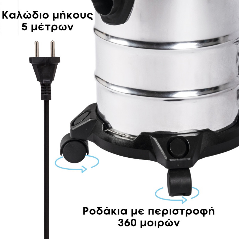 Με τη χωρητικότητα των 20 λίτρων και τον ισχυρό κινητήρα των 1000W, μπορεί να απορροφήσει εύκολα χώματα, τρίχες, σκόνες αλλά και υγρά. Η λειτουργία φυσήματος είναι ιδανική για το καθάρισμα φύλλων από αυλές ή για το φούσκωμα αντικειμένων.