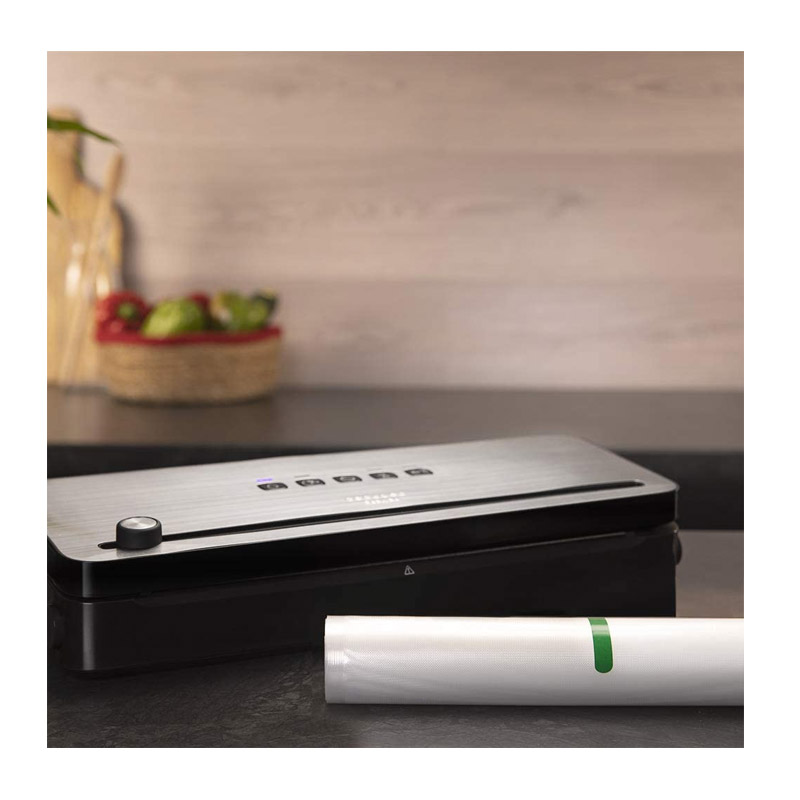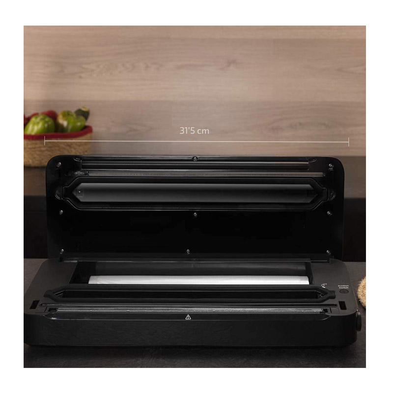 Η συσκευή έχει ισχύ 140 W, αυτόματη λειτουργία σφράγισης κενού με μόνο 1 κουμπί, φως LED κατά τη σφράγιση, μήκος στεγανοποίησης μέχρι 31 cm και ενσωματωμένο πτυσσόμενο κόπτη και ρολό για πιο γρήγορη και πιο άνετη χρήση.