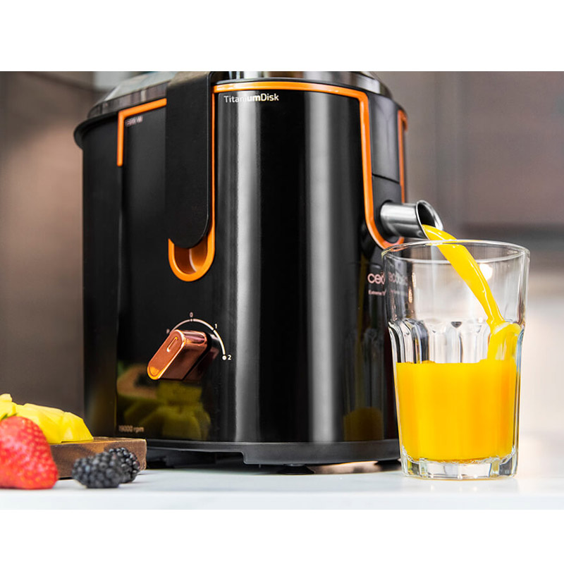 Με τον αποχυμωτή Extreme Titanium 19000 XXL, από την εταιρία Cecotec, θα απολαύσετε ολόφρεσκους χυμούς γρήγορα και εύκολα. Μπορείτε να εισαγάγετε ολόκληρα φρούτα και λαχανικά, φτιάχνοντας γευστικά smoothies με τον ταχύτερο και πιο άνετο τρόπο. Ο αποχυμωτής χωράει αρκετά φρούτα και λαχανικά, χάρη στο φυγοκεντρικό σύστημα και στην ταχύτητα των 19000 rpm. Θα φτιάχνετε smoothies με περισσότερες βιταμίνες και θρεπτικά συστατικά, παίρνοντας παράλληλα 30% περισσότερο χυμό.