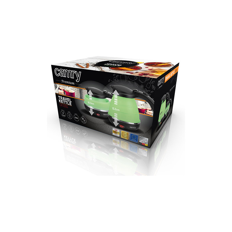 Ο βραστήρας, από την εταιρία Camry, έχει αναδιπλούμενο σχεδιασμό και σώμα από μαλακή σιλικόνη, για εύκολη αποθήκευση. Διαθέτει ισχύ 750 W, λαβή από πλαστικό, φωτιζόμενο διακόπτη ενεργοποίησης / απενεργοποίησης και χωρητικότητα 0.5 Lt.