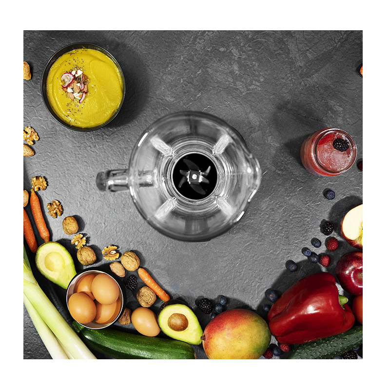 Το μπλέντερ, είναι εξοπλισμένο με λεπίδα 6 φύλλων με μαύρη επίστρωση τιτανίου υψηλής ποιότητας, που θα σας επιτρέψει να αξιοποιήσετε στο έπακρο όλες τις θρεπτικές ουσίες των τροφίμων και να αποκτήσετε τις καλύτερες υφές. Το μαύρο τιτάνιο βελτιώνει την σκληρότητα από το ατσάλι, διατηρώντας έτσι τις λεπίδες αιχμηρές για μεγαλύτερο χρονικό διάστημα και με καλύτερα αποτελέσματα. Η κανάτα του έχει χωρητικότητα 2.1 Lt και είναι κατασκευασμένη από λιωμένο γυαλί υψηλής αντοχής, ανθεκτική στις θερμικές διαταραχές, ώστε να μην χρειάζεται να ανησυχείτε όταν φτιάχνετε ζεστές κρέμες ή ψιλοκομμένο πάγο, ενώ πλένεται στο πλυντήριο πιάτων.