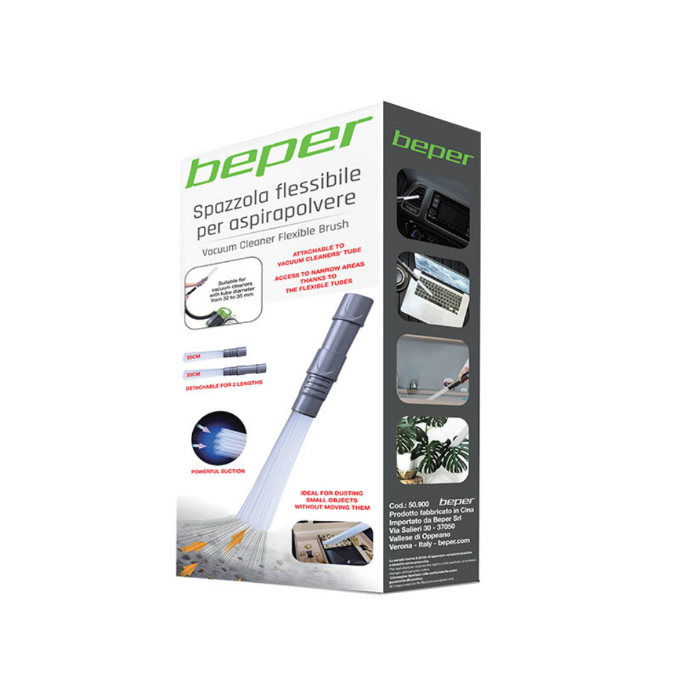Η εύκαμπτη βούρτσα της Beper είναι συμβατή με όλες τις ηλεκτρικές σκούπες με διάμετρο σωλήνα από 32 έως 35 mm. Επιπλέον έχει ρυθμιζόμενο μήκος με 2 επιλογές: 25 ή 33 cm. Έτσι μπορείτε να φέρετε τη σκούπα στα μέτρα σας!