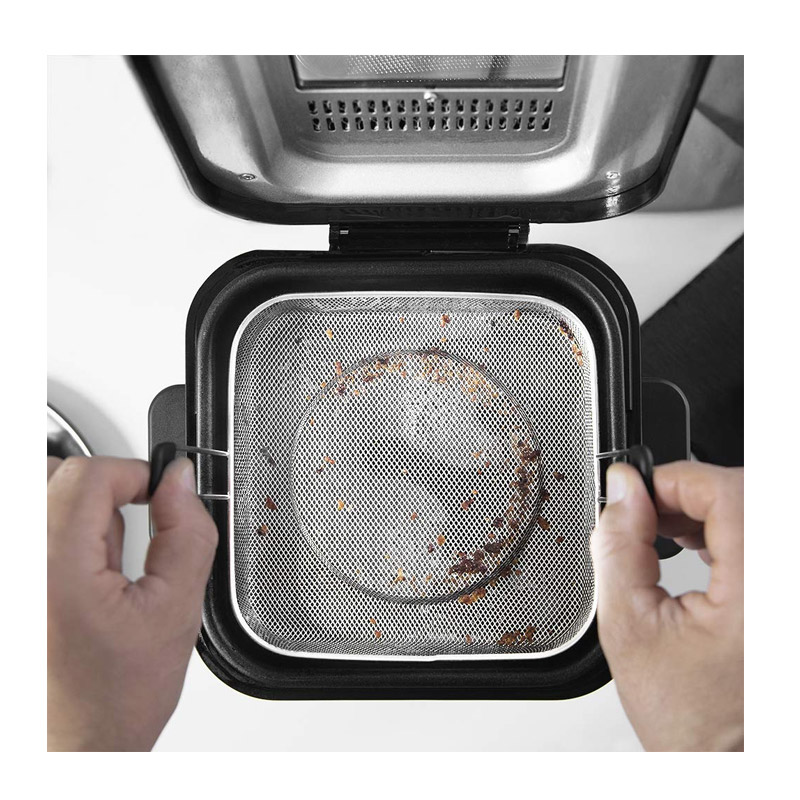 Η φριτέζα περιλαμβάνει ένα πρωτοποριακό φίλτρο OilCleaner, το οποίο επιτρέπει να διατηρείτε το λάδι καθαρό για μεγαλύτερο χρονικό διάστημα, επεκτείνοντας την ωφέλιμη ζωή του. Για να καθαρίσετε το λάδι, απλά ανασηκώστε το φίλτρο και αφαιρέστε τα υπολείμματα που εναποτίθενται σε αυτό, αφού ολοκληρωθεί η διαδικασία τηγανίσματος. Ένας εύκολος και απλός τρόπος για να αφαιρέσετε τις ακαθαρσίες από το λάδι για να μπορείτε να το χρησιμοποιήσετε ξανά όποτε θέλετε.
