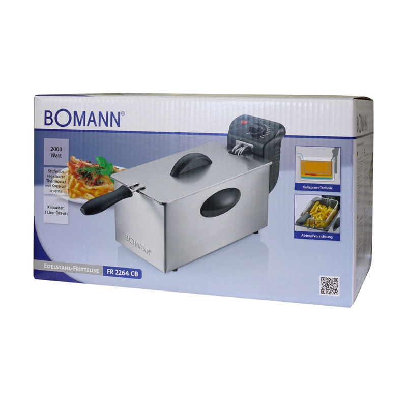 Η Ηλεκτρική Φριτέζα της Bomann FR 2264 διαθέτει σώμα από ανοξείδωτο ατσάλι, χωρητικότητας 8 λίτρων, με αφαιρούμενο δοχείο λαδιού για εύκολο καθαρισμό μετά το τηγάνισμα.