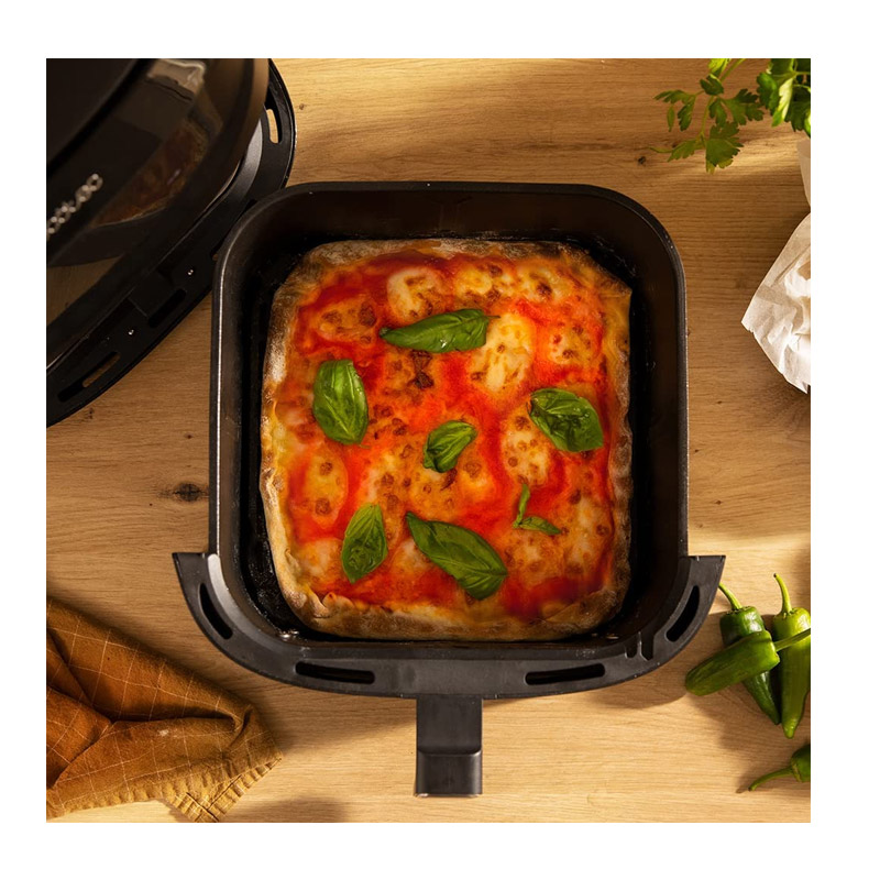 Η φριτέζα αέρος, έχει ρυθμιζόμενη θερμοκρασία από 80 έως 200 °C, κάδο χωρητικότητας 7.6 Lt για το μαγείρεμα μεγάλων ποσοτήτων φαγητού, ρυθμιζόμενο χρόνο από 0 έως 60 λεπτά και ισχύ 2000 W για γρήγορο μαγείρεμα όλων των πιάτων. Τόσο ο δίσκος όσο και το καλάθι της φριτέζας είναι αφαιρούμενα και έχουν αντικολλητική επίστρωση.