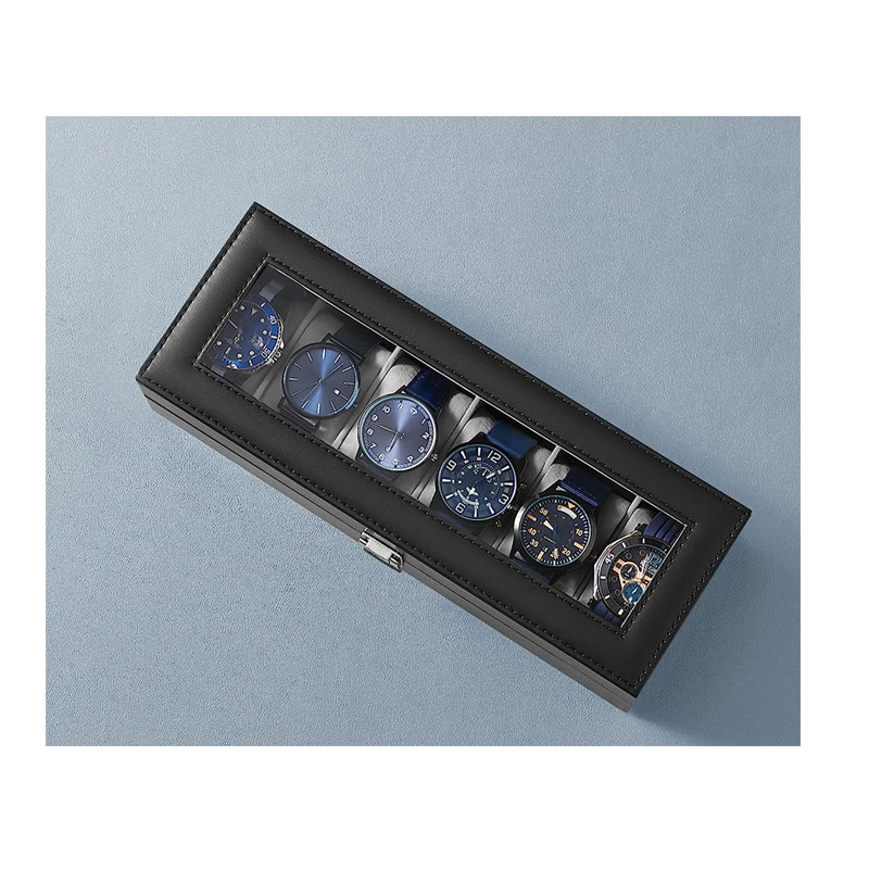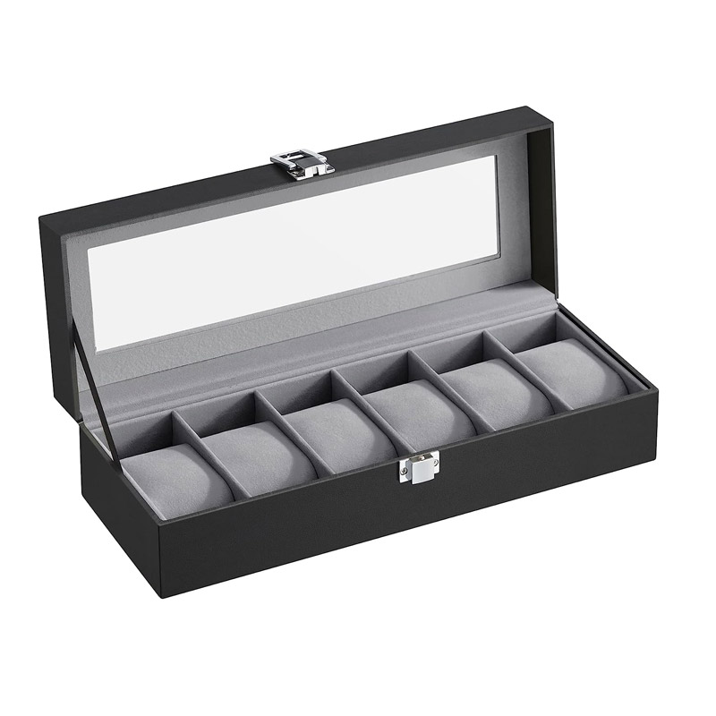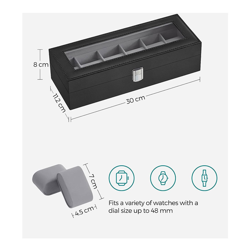 Η κοσμηματοθήκη - μπιζουτιέρα από την εταιρεία Songmics, διαθέτει 6 διαμερίσματα, με αφαιρούμενα ένθετα που μπορούν να τοποθετηθούν υπό γωνία ή να αφαιρεθούν εντελώς. Μπορείτε να αποθηκεύσετε έως 6 ρολόγια ή διάφορα άλλα κοσμήματα. Το εσωτερικό της είναι γεμισμένο με μαλακό υλικό που προστατεύει τα κοσμήματα από τις γρατζουνιές ενώ εξωτερικά φέρει κομψή επένδυση από συνθετικό δέρμα. Κλειδώνει για να μην ανοίγει εύκολα και έχει ακρυλικό γυαλί στο πάνω μέρος, έτσι ώστε να μπορείτε να βλέπετε τι υπάρχει στο εσωτερικό της.