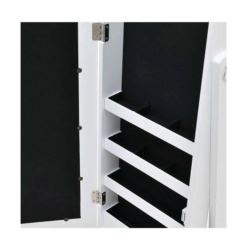 Η κοσμηματοθήκη μπιζουτιέρα, από την εταιρία Atmosphera, είναι κατασκευασμένη από MDF κατηγορίας Ε1. Είναι εξοπλισμένη με καθρέπτη στην πόρτα, απαλό βελούδινο εσωτερικό κάλυμμα, γάντζους, κρεμάστρες και ράφια στο εσωτερικό της, για τα κοσμήματά σας.
