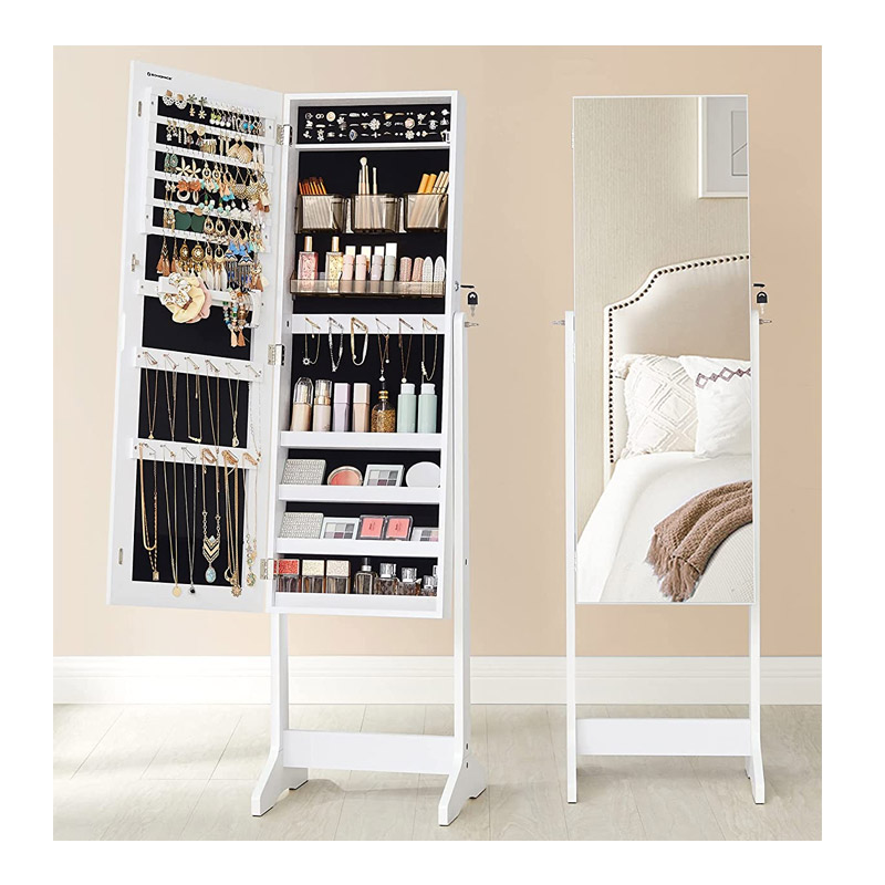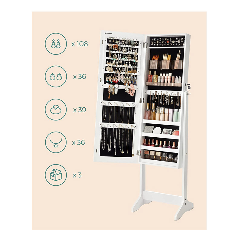 Η κοσμηματοθήκη μπιζουτιέρα, από την εταιρία Songmics, είναι κατασκευασμένη από ανθεκτικό MDF ξύλο για μακροχρόνια χρήση και το εσωτερικό της είναι καλυμμένο από μαλακό ύφασμα. Εξωτερικά, η κοσμηματοθήκη διαθέτει ολόσωμο καθρέπτη χωρίς πλαίσιο. Κλείνει με κλειδαριά και 2 κλειδιά, για μεγαλύτερη ασφάλεια.