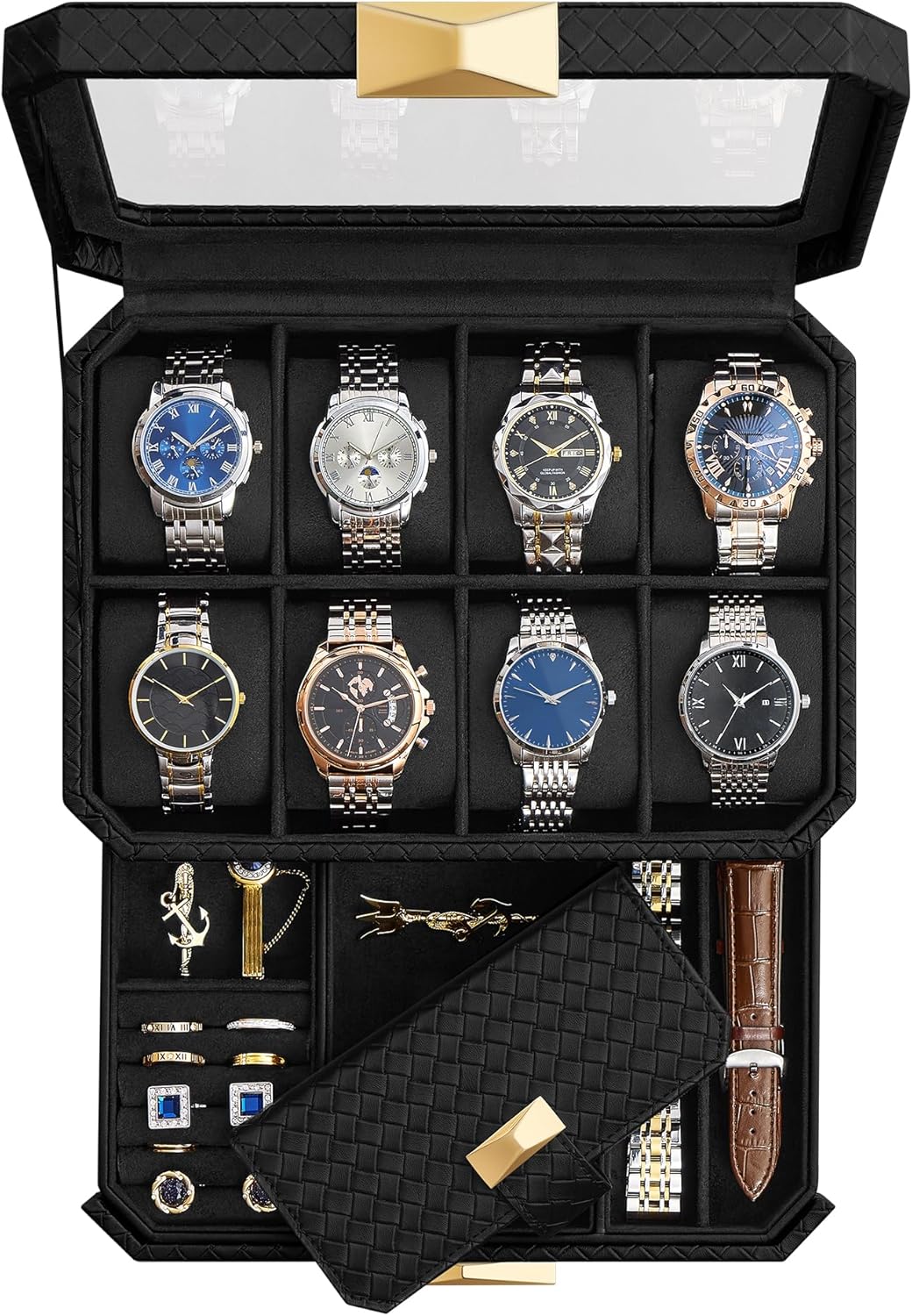 Κουτί Ρολογιών 8 Θέσεων 2 Επίπεδα με Καπάκι και Θήκη Ταξιδίου 19.5 x 27.3 x 14.5 cm Μαύρο JWB025B01 Songmics
