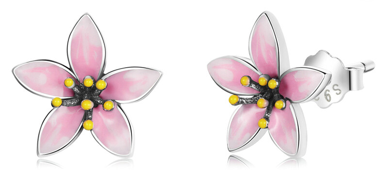 Εντυπωσιακά σκουλαρίκια Bamoer σε σχήμα λουλουδιού, κατασκευασμένα από ασήμι 925, σε απαλό ροζ χρώμα και λεπτομέρειες από οξειδωμένο ασήμι.