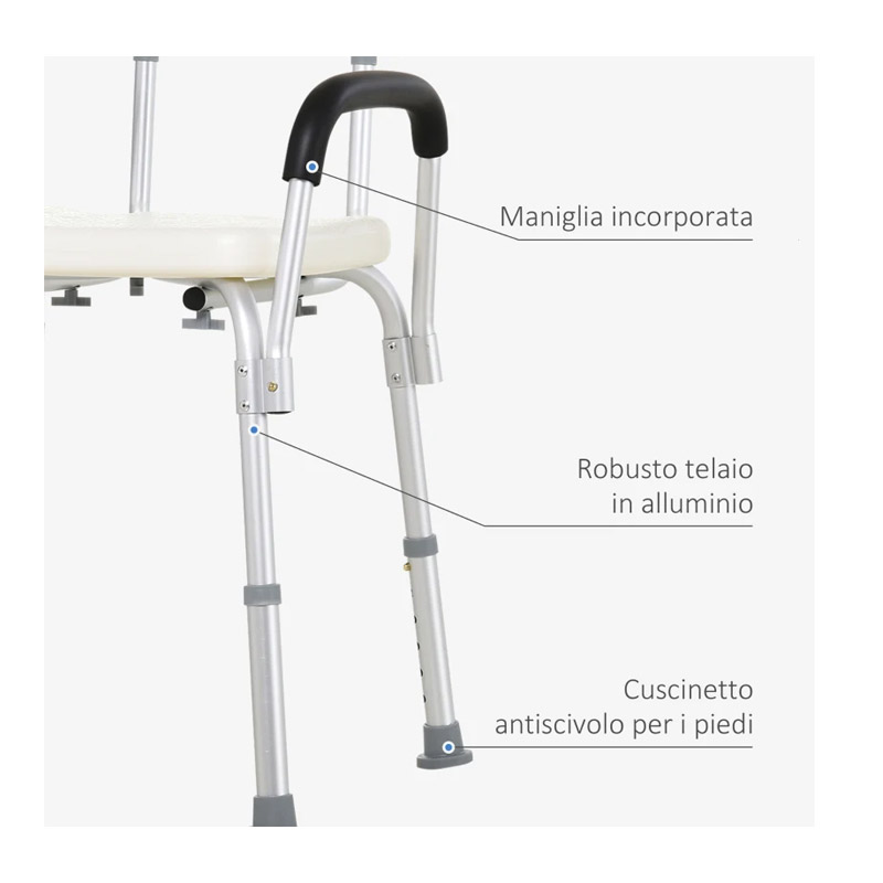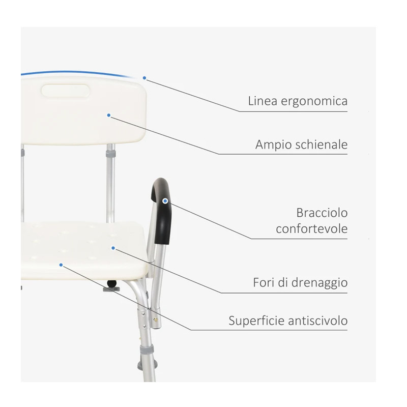 Η καρέκλα μπάνιου, από την εταιρία HOMCOM, είναι κατάλληλη για ηλικιωμένους και άτομα με περιορισμένη κινητικότητα. Διαθέτει πλαίσιο αλουμινίου βαρέως τύπου με μέγιστο βάρος 135 Kg, υψηλής πυκνότητας αντιβακτηριδιακό κάθισμα πολυαιθυλενίου με οπές αποστράγγισης του νερού και μπράτσα με επένδυση για αυξημένη άνεση και υποστήριξη στον χρήστη.