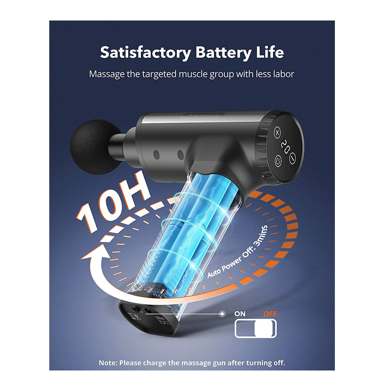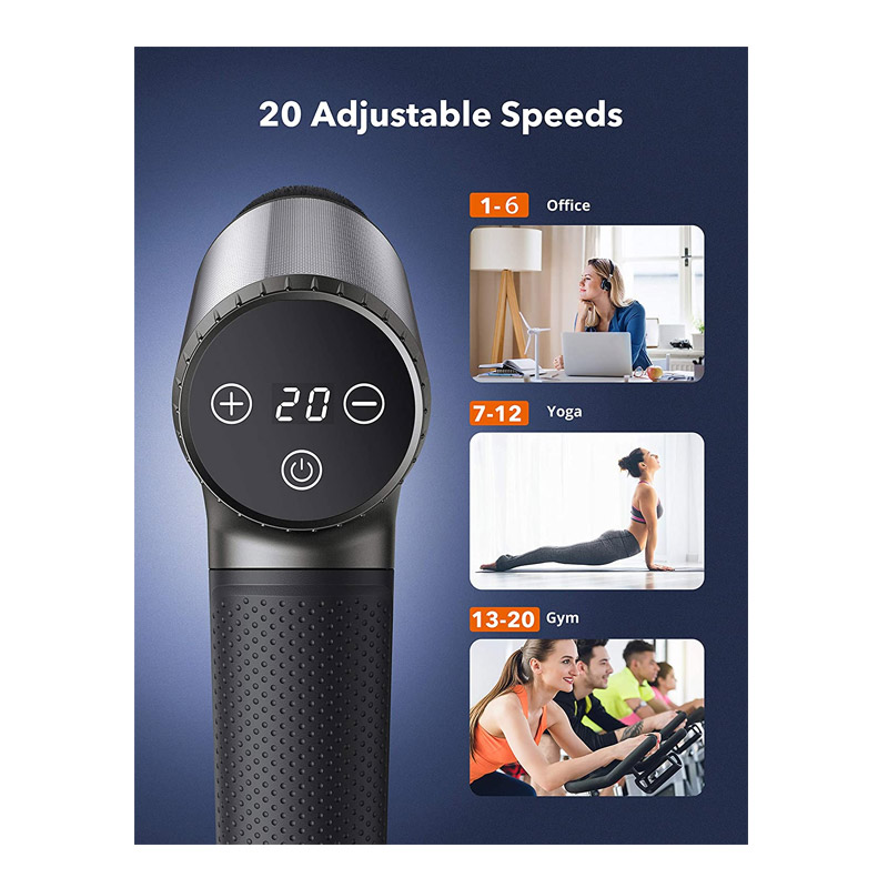 Η συσκευή, διαθέτει 20 ρυθμιζόμενα επίπεδα ταχύτητας, κινητήρα 42.6 W υψηλής ροπής 800 έως 3200 στροφές το λεπτό και δύναμη πίεσης έως 17 Kg, για να κάνετε μασάζ σε βάθος στους μυς που στοχεύετε να ανακουφίσετε αποτελεσματικά τον πόνο και τη δυσκαμψία. Με LED οθόνη, αντιολισθητική λαβή και μπαταρία 2600 mAh 3C που διαρκεί έως και 10 ώρες. Μπαίνει αυτόματα σε Sleep mode μετά από 3 λεπτά όταν δεν γίνεται καμία λειτουργία, ούτως ώστε να παραταθεί η διάρκεια ζωής της μπαταρίας.