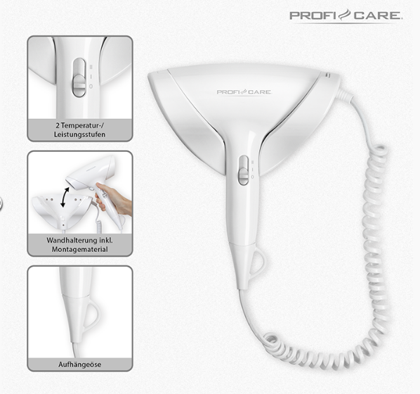Το επιτοίχιο σεσουάρ Proficare PC-HT 3044 είναι ιδανικό για εξοικονόμηση χώρου, προσφέροντας ισχυρή απόδοση 1800W. Διαθέτει αυτόματη απενεργοποίηση όταν τοποθετείται στη βάση του, σπιράλ καλώδιο για ευελιξία, και λειτουργία κρύου αέρα για τέλειο styling. Εξοπλισμένο με προστασία από υπερθέρμανση και εύκολη επιτοίχια τοποθέτηση, αποτελεί ιδανική λύση για ξενοδοχεία, γυμναστήρια και οικιακή χρήση.